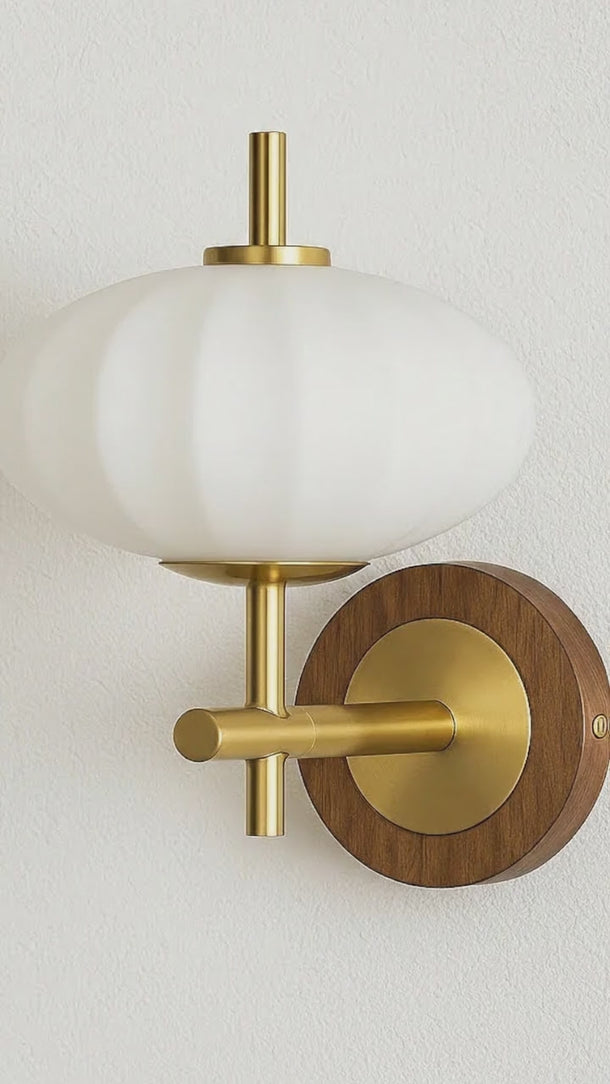 Arandela LED moderna Ally com design mid-century escandinavo: base circular em madeira natural escura com veios, estrutura metálica dourada tipo "T" invertido e globo achatado horizontal tipo lanterna chinesa em vidro branco leitoso com linhas verticais suaves. Design minimalista mid-century que proporciona iluminação difusa através de globo tipo lanterna orgânico. Luminária de parede decorativa ideal para lavabos, corredores e ambientes escandinavos mid-century. Explore nossa coleção de arandelas modernas.