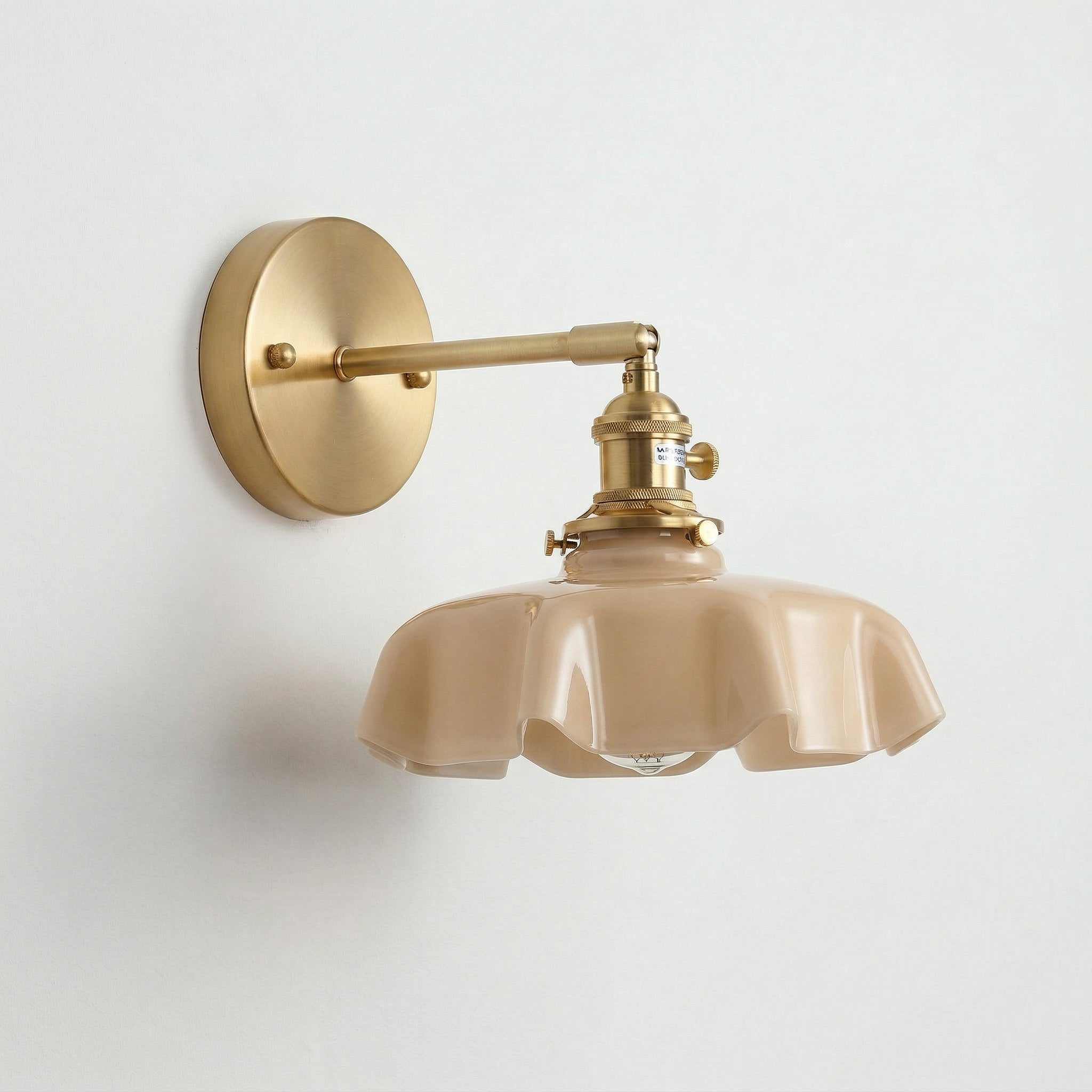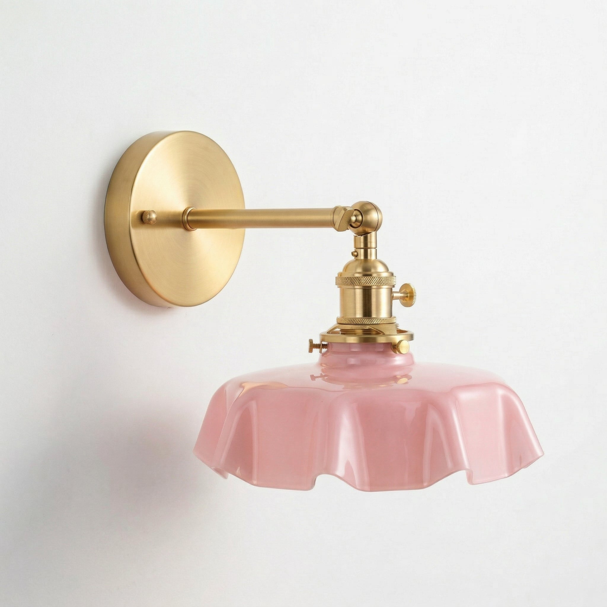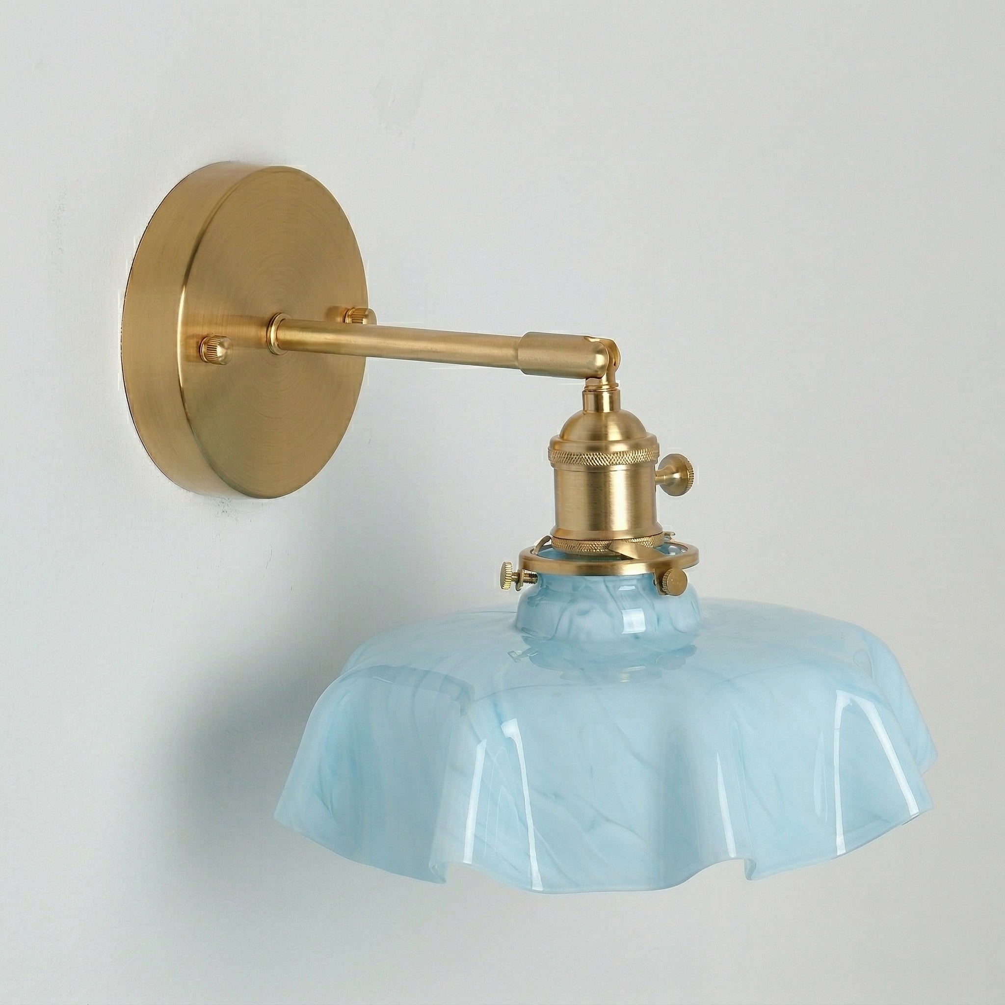 Arandela de parede retrô com cúpula em vidro rendado com bordas recortadas em estilo floral, disponível em creme, azul, rosa e verde menta. Braço fixo em metal dourado com interruptor knob integrado, unindo charme vintage e funcionalidade. LED não incluso. Explore nossa linha de luminárias retrô.