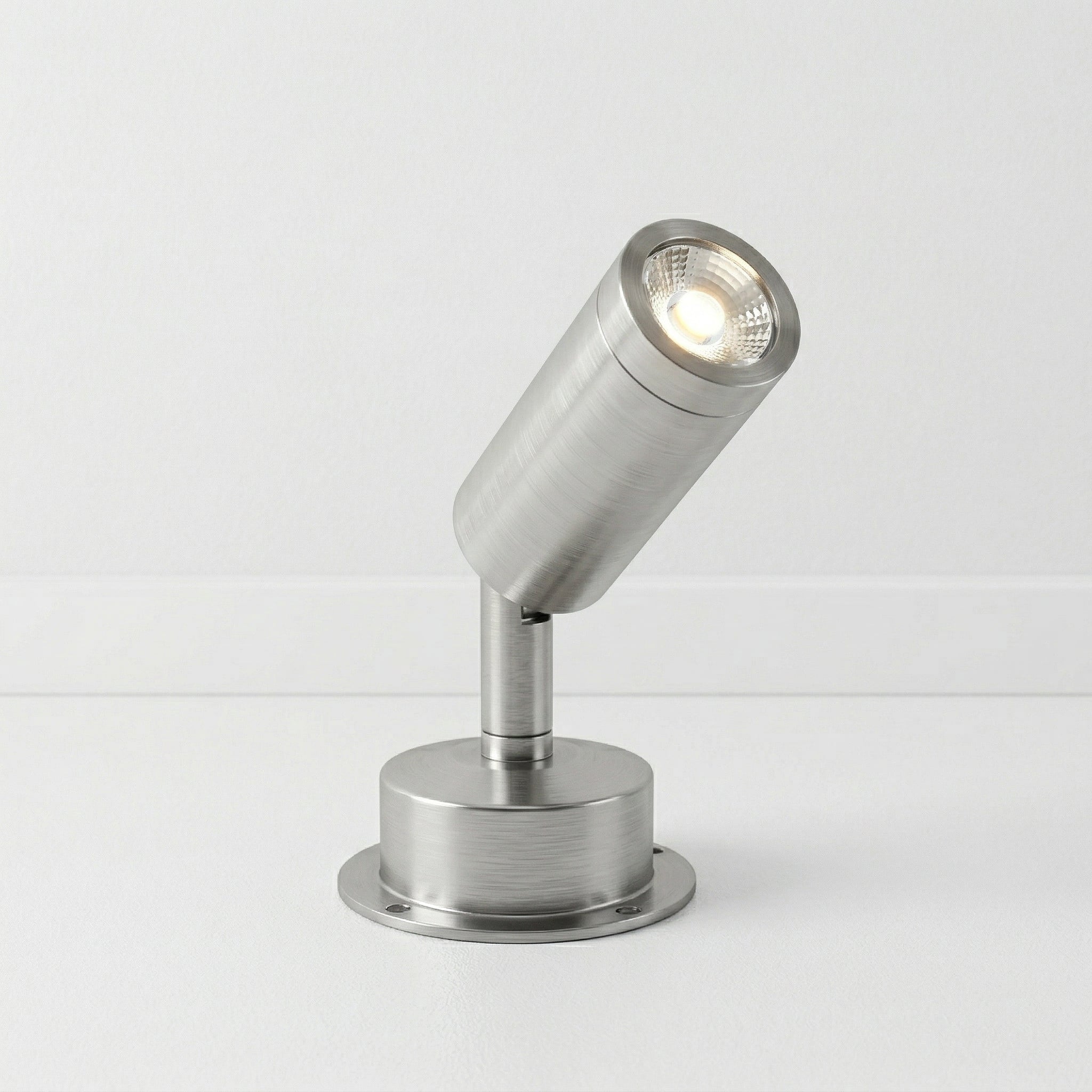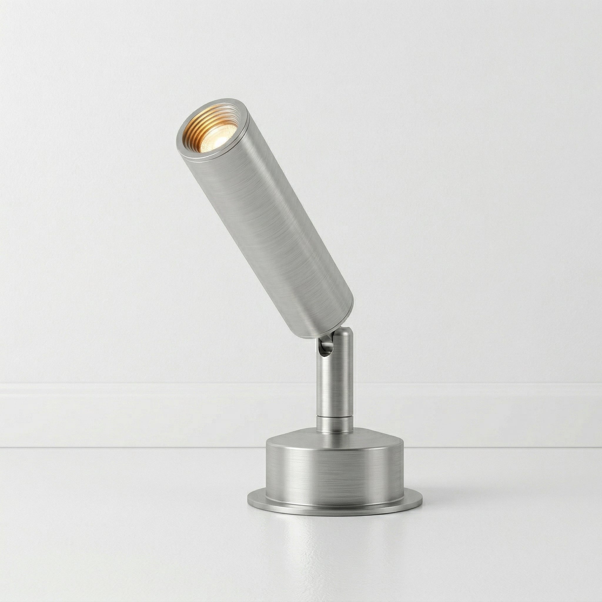 Mini spot LED de sobrepor direcionável em corpo cilíndrico de alumínio, disponível em preto e prata com diâmetros de 2 a 5cm. Base articulada permite ajuste preciso do foco em 360°, destacando quadros, nichos e objetos com elegância minimalista. Escolha de arquitetos para projetos residenciais e comerciais. Explore nossos spots mini focos.