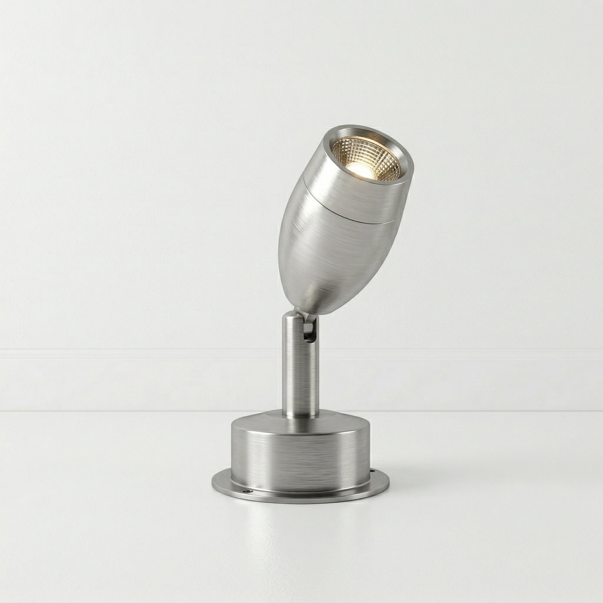 LED integrado bivolt (85–265V) com certificações CE, RoHS e CCC — qualidade comprovada e 5 anos de garantia. Corpo em alumínio garante dissipação de calor eficiente e longa vida útil. Mini spot direcionável ideal para vitrines, closets, corredores e destaque de objetos especiais. Veja também nossos spots de sobrepor.