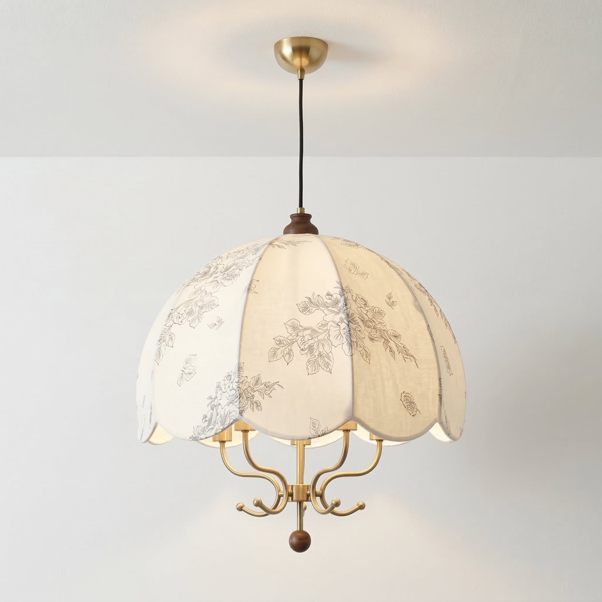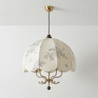 Pendente de tecido em formato guarda-chuva com borda recortada e estampa botânica delicada — a estrutura interna em metal bronze envelhecido dialoga com o creme do abajur criando um ambiente romântico e acolhedor sem esforço. Explore nossa coleção de luminárias clássicas.
