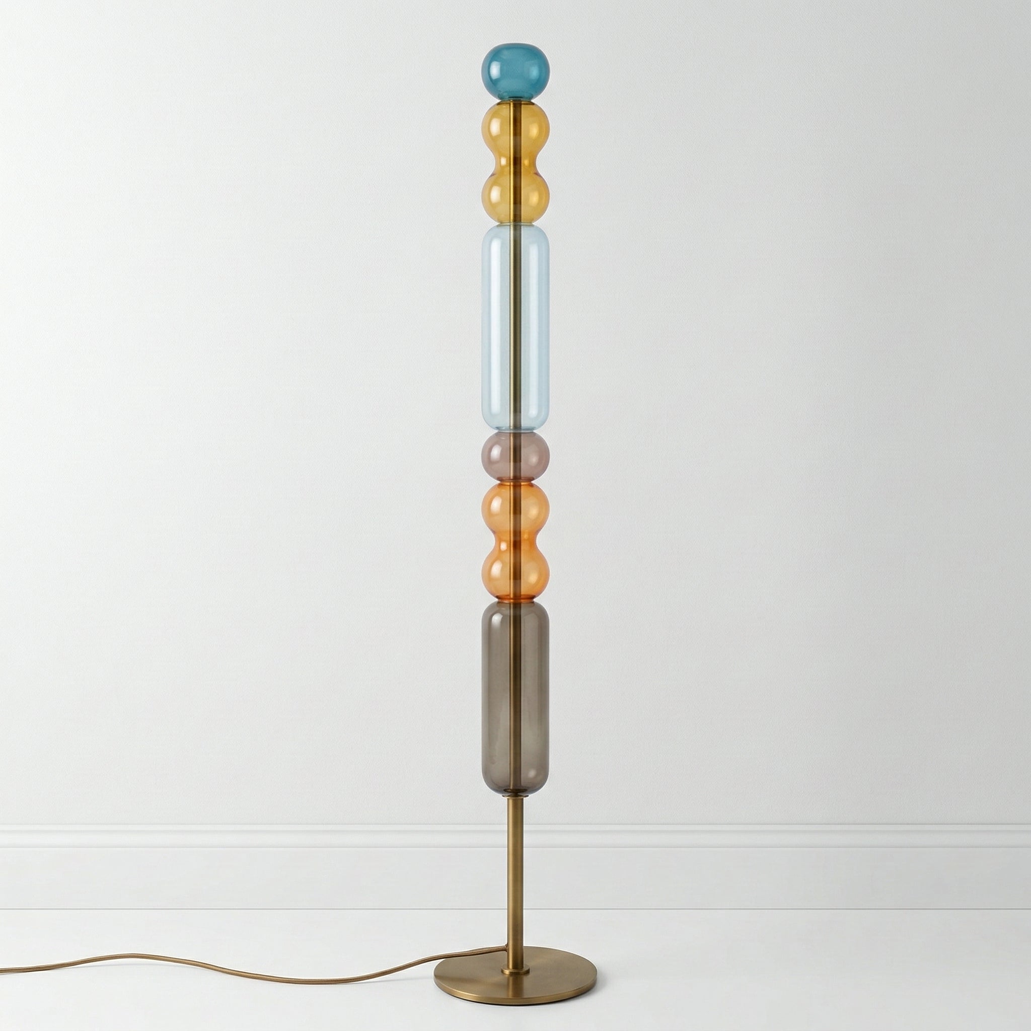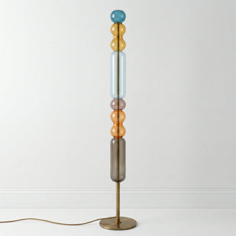 Olha só — esta luminária de piso é daquelas que param a conversa. A coluna de esferas e cilindros em vidro colorido empilhados em azul, amarelo, lilás e laranja faz dela mais uma luminária decorativa do que simplesmente uma fonte de luz. Com cerca de 1,7m, funciona sozinha no centro da sala ou num canto estratégico. Veja nossa coleção de luminárias de piso.