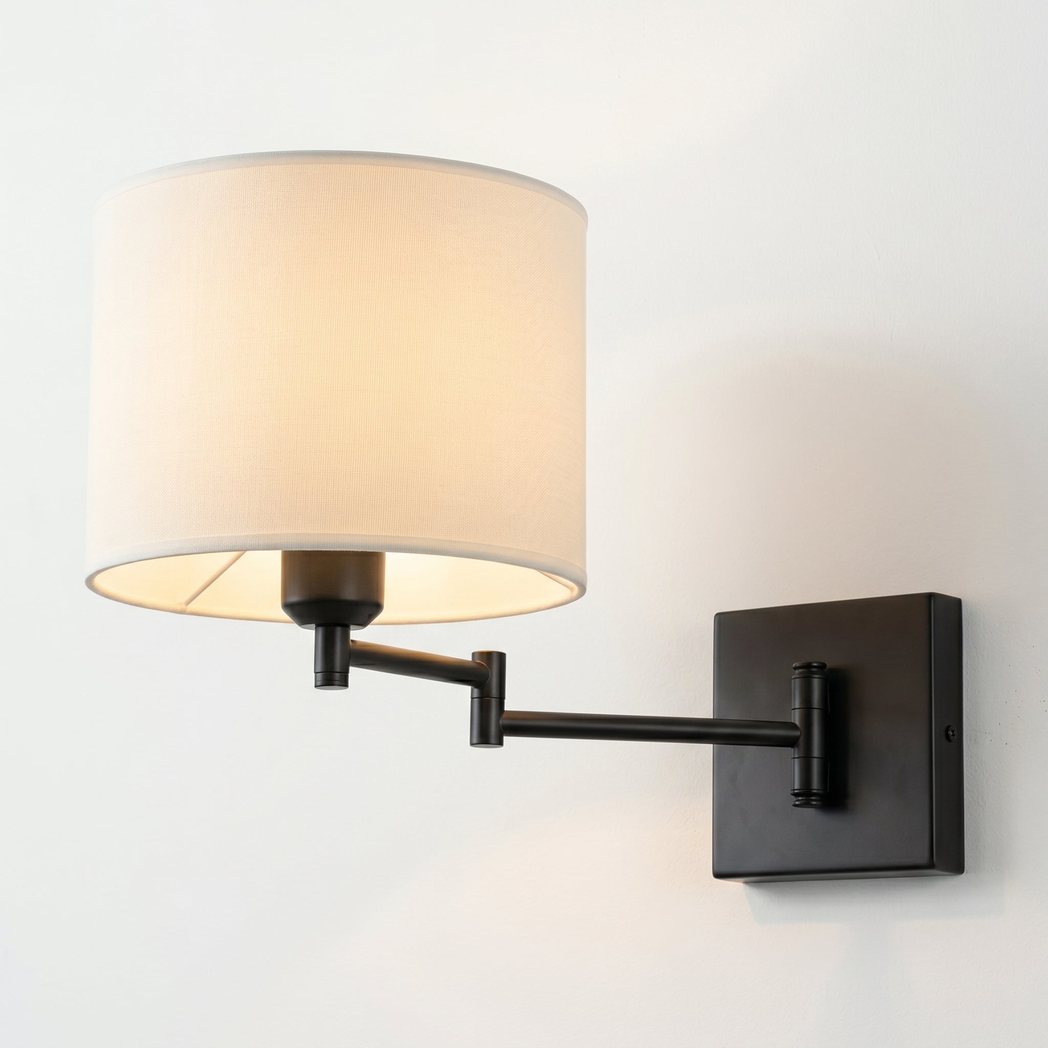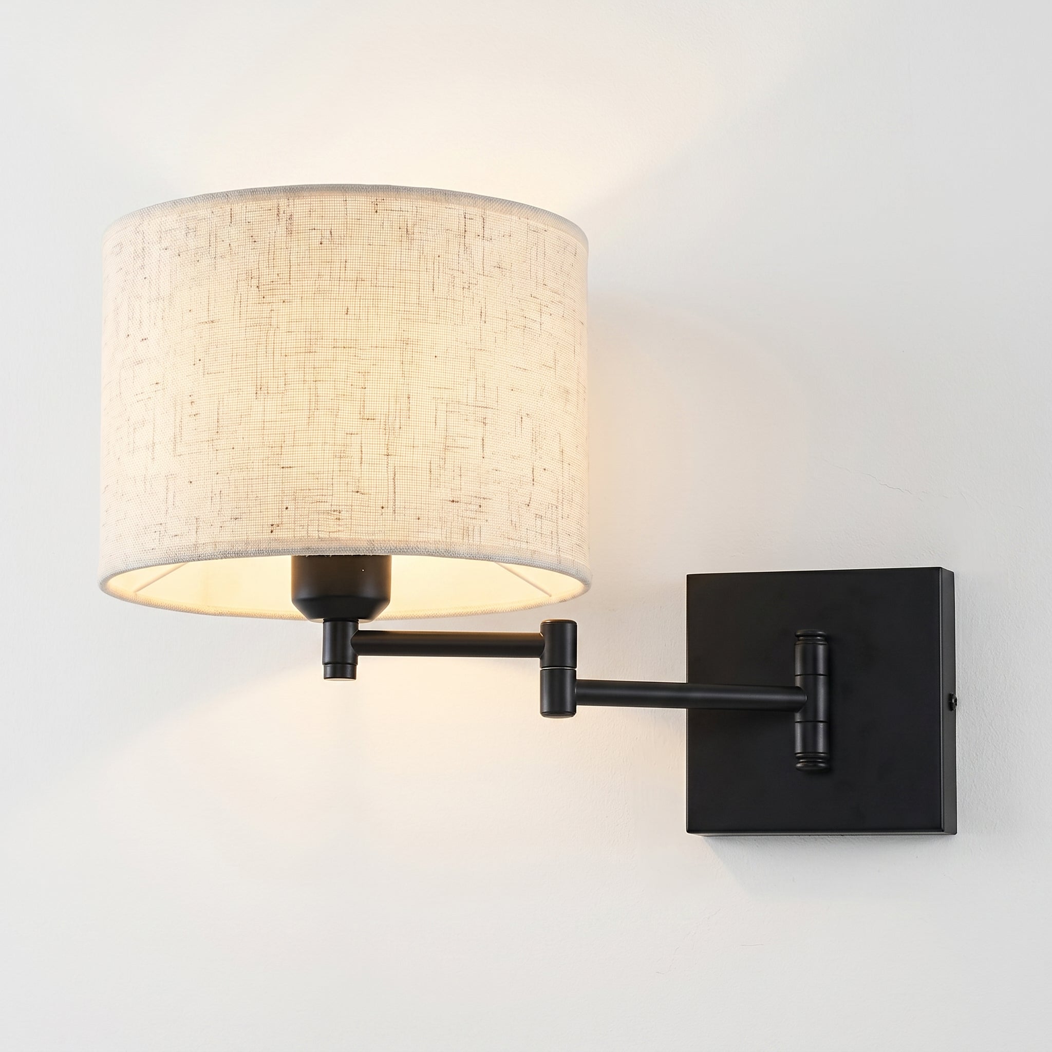 Arandela articulada para leitura com cúpula cilíndrica em tecido linho bege ou branco liso (Ø23cm) e braço articulado dobrável de 11cm em metal preto fosco. Design contemporâneo minimalista que combina funcionalidade e sofisticação em quartos e escritórios. Braço recolhível junto à parede quando não utilizado. Explore nossa linha de luminárias articuladas.