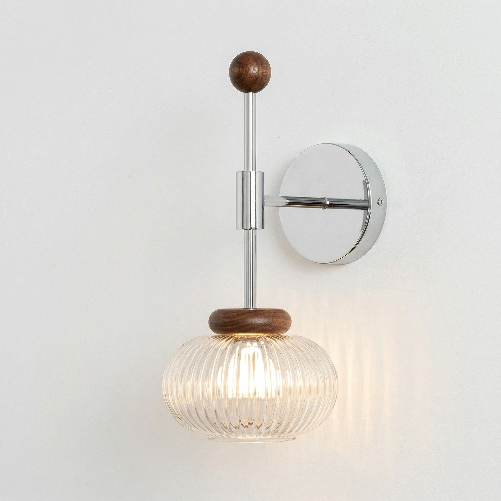 Arandela de parede Chapel com cúpula esférica em vidro canelado âmbar e detalhes em madeira nogueira. Haste cromada de 46cm confere elegância contemporânea com luz difusa e suave. Ideal para quartos e salas de 3 a 5m². Explore nossas luminárias decorativas.