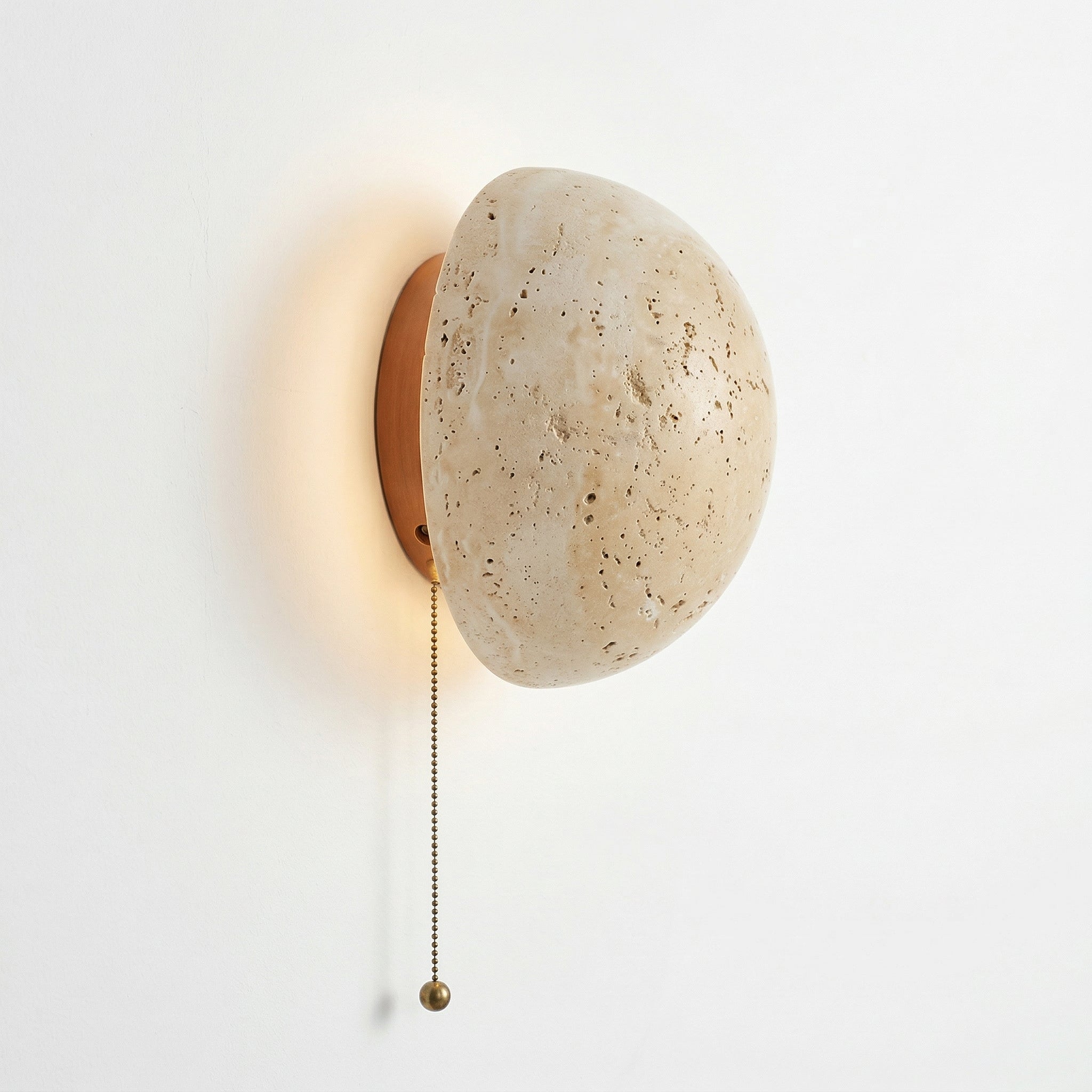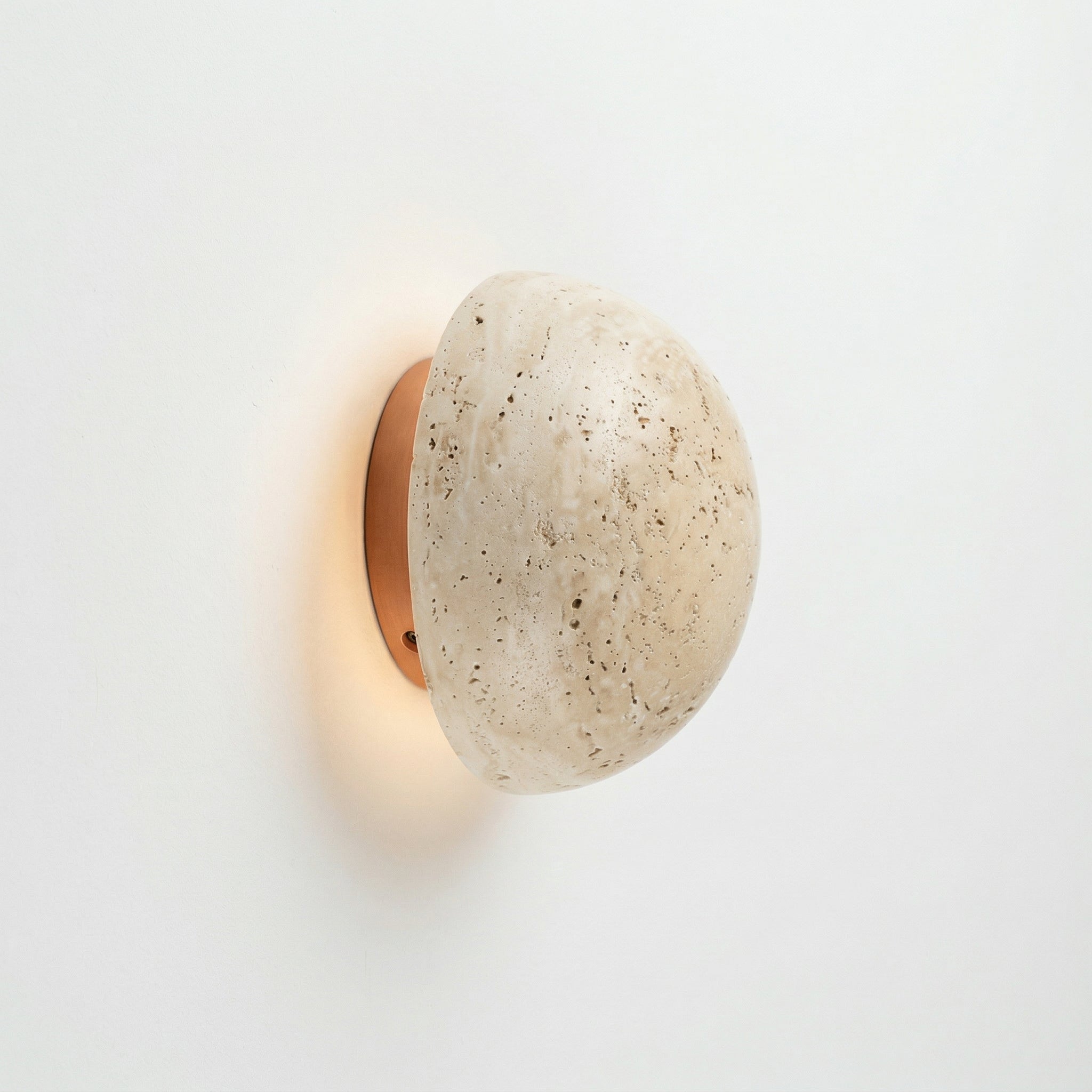 Arandela de parede Thuin esculpida em travertino natural com iluminação difusa em halo. Textura orgânica da pedra e base em metal cobre criam design escultórico único. Luminária contemporânea para salas e quartos de alto padrão. Explore nossas luminárias decorativas.