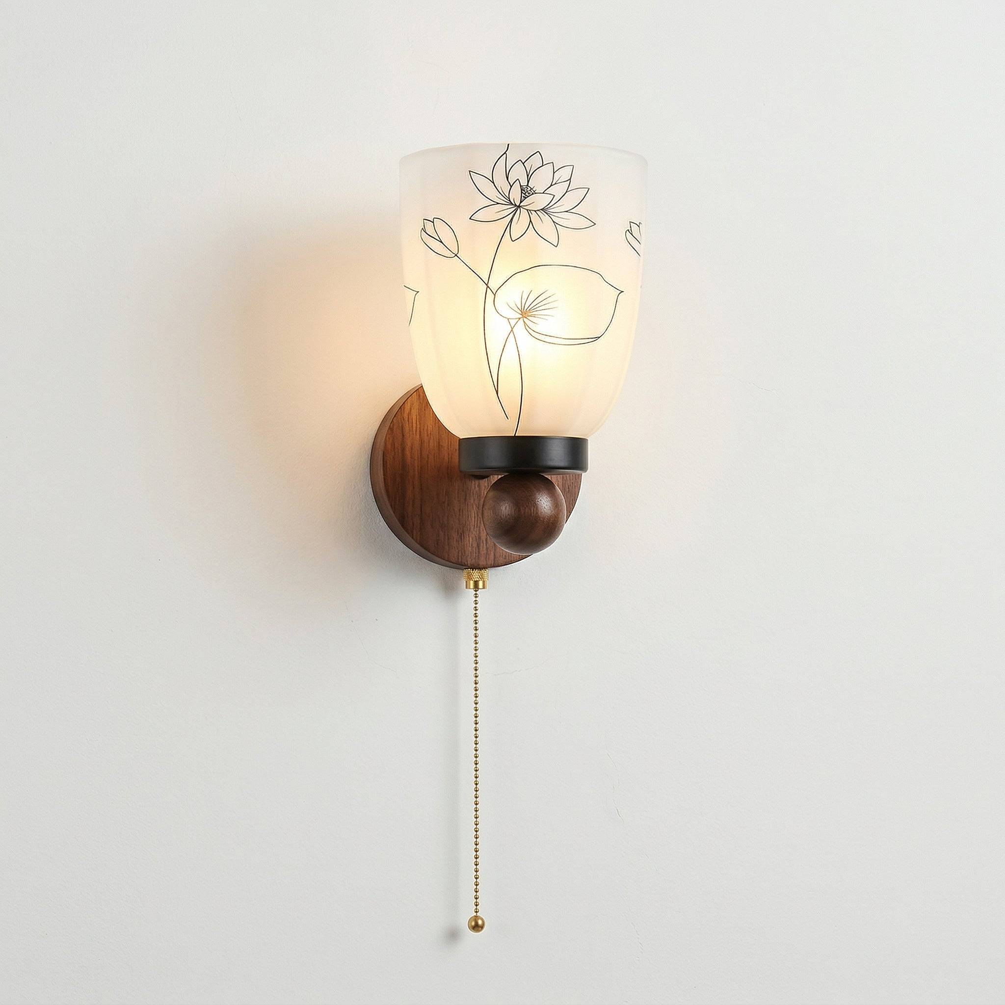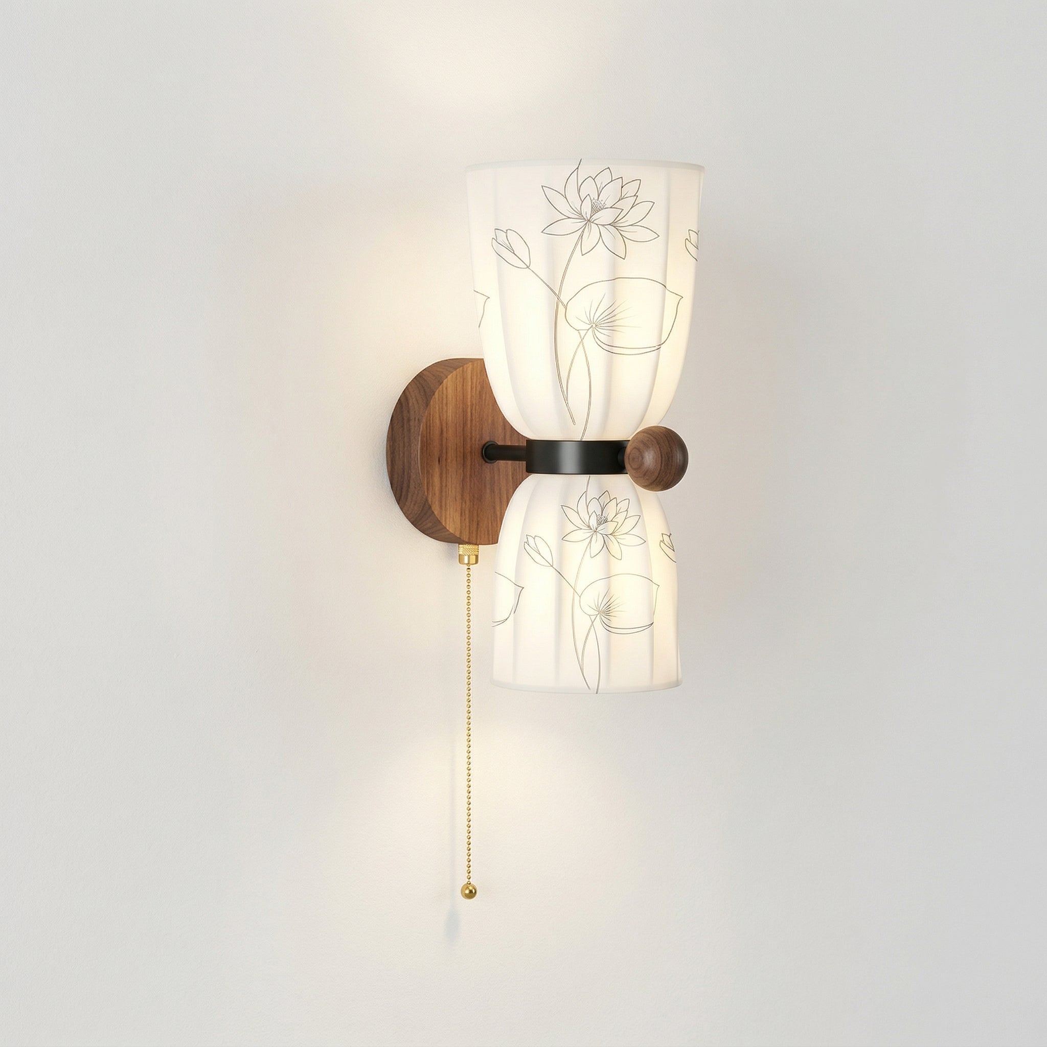 Arandela de parede Dunedin no estilo Novo Chinês com cúpula em tecido creme e delicada estampa de lótus. Base e esfera decorativa em madeira escura com suporte em metal preto fosco (24×15,5cm). Luminária clássica sofisticada para quartos e salas. Explore nossas luminárias clássicas.