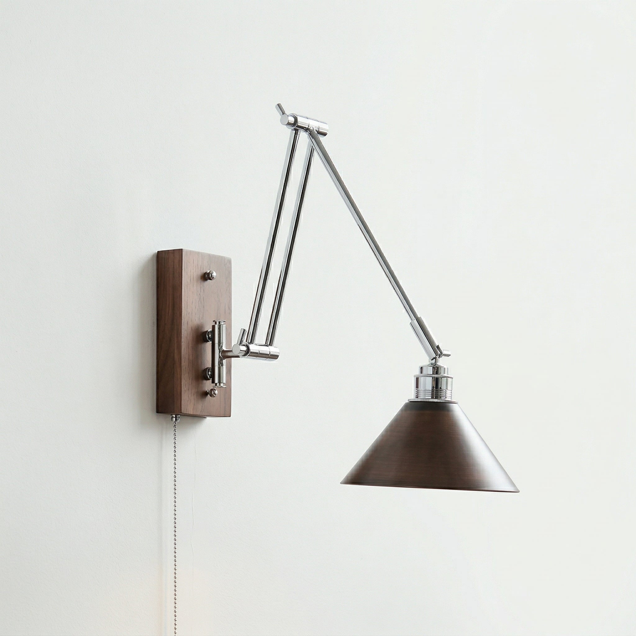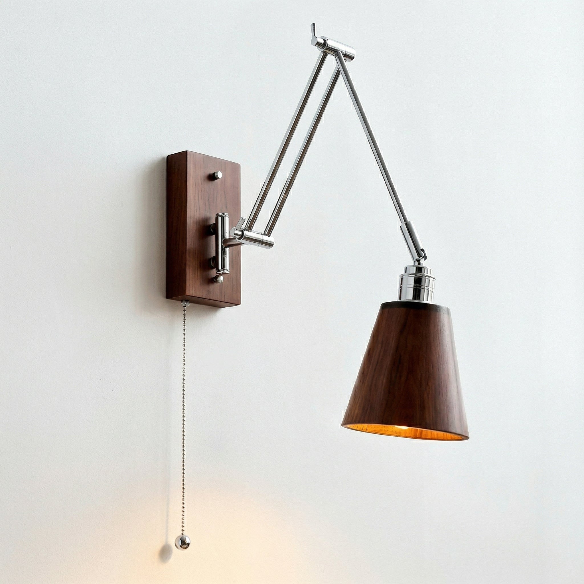 Arandela articulada Davis com braços cromados e cúpula cônica em madeira escura de 21cm. Design escandinavo sofisticado que une textura natural e metal brilhante. Três articulações 180° garantem luz perfeitamente direcionada. Explore nossas luminárias articuladas.