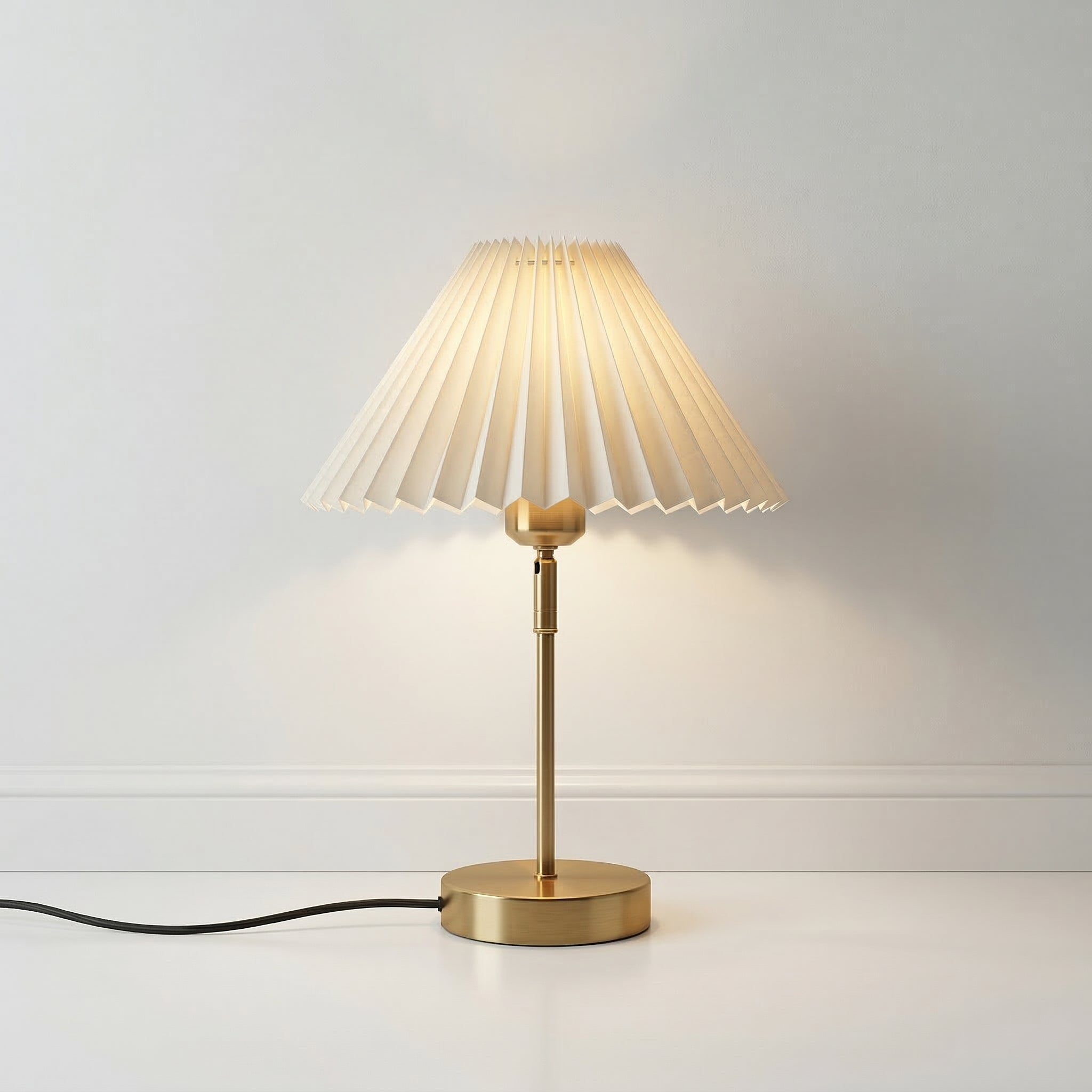 Sabe aquela luminária de mesa com cúpula plissada que aparece em todo quarto bem decorado? Com 36cm de altura e base redonda de 12cm em metal dourado, ela tem presença clássica sem ocupar espaço demais. Fica perfeita no criado-mudo ou num aparador da entrada. Veja mais nas nossas luminárias clássicas.