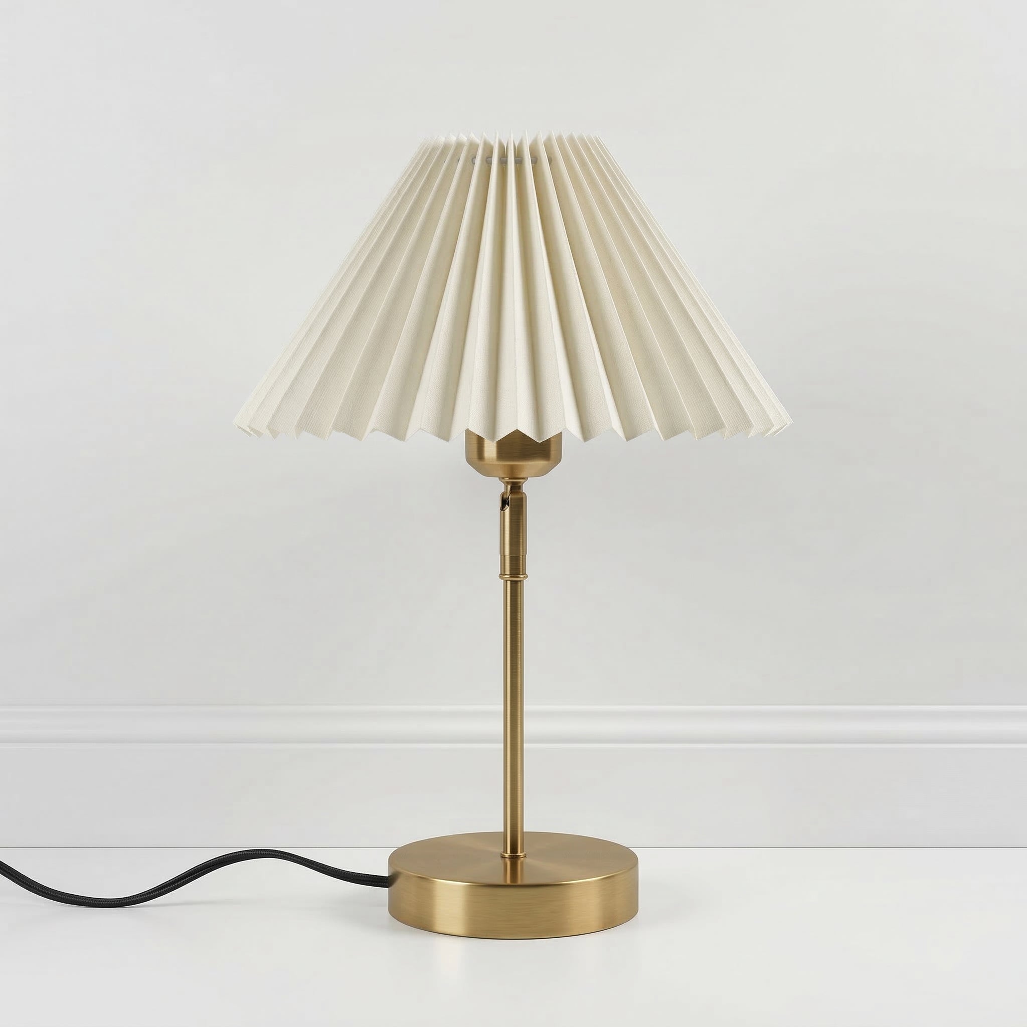 A cúpula em tecido plissado creme de 24cm filtra a luz de um jeito muito agradável — suave para o ambiente, mas focada o bastante para leitura no criado-mudo. A haste fina em latão dourado equilibra bem com decorações neutras e madeiras claras. Confira nossa coleção de luminárias para leitura.