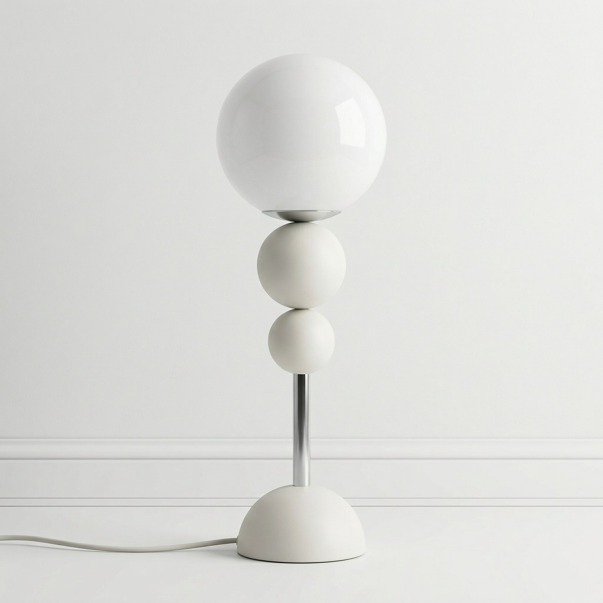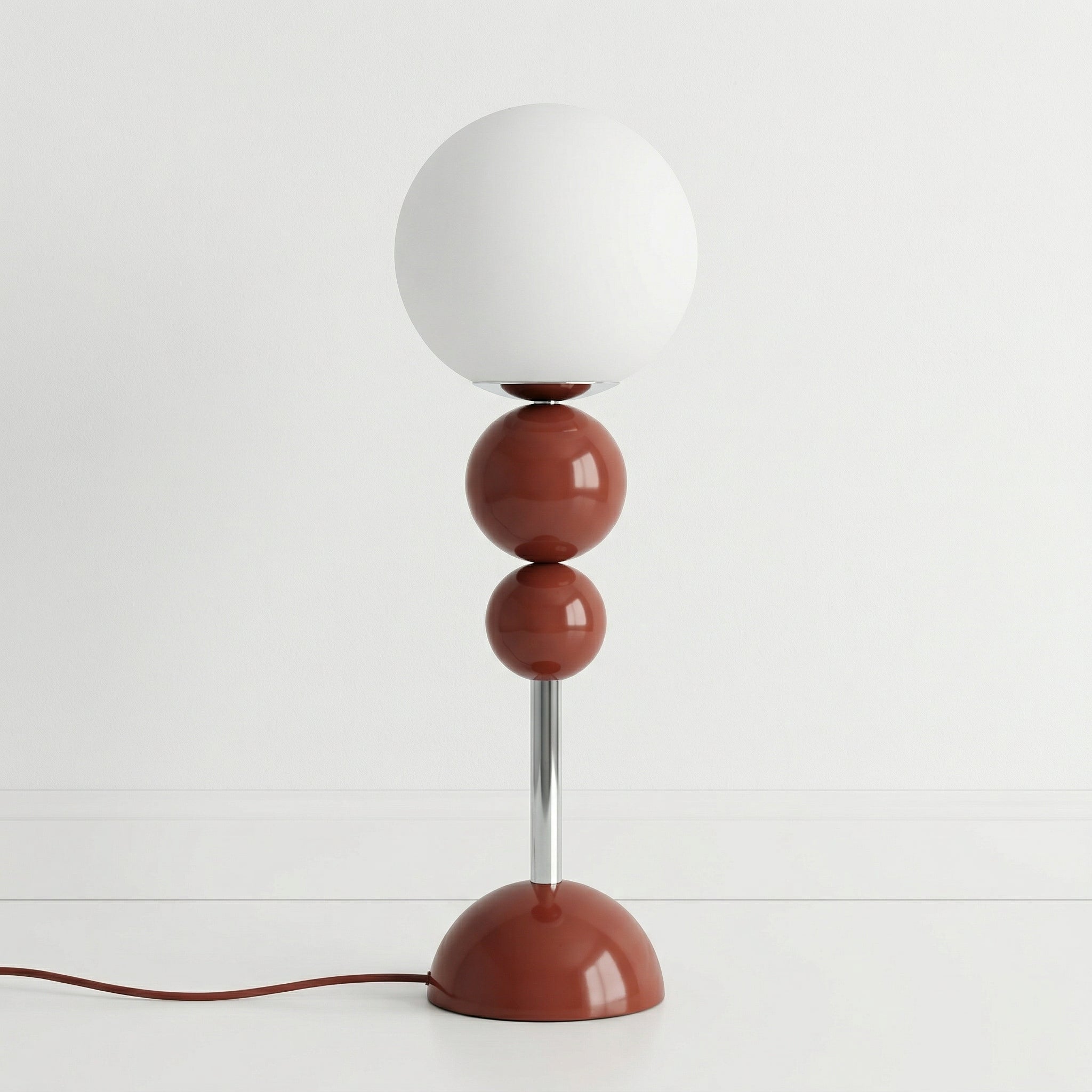A luminária de mesa com esferas empilhadas em esmalte fosco e cúpula globo em vidro opalino é pura geometria pop com alma retrô — disponível em terracota, off-white e verde sage para dialogar com diferentes paletas de decoração. A haste cromada entre as esferas adiciona leveza e sofisticação ao conjunto. Explore luminárias de mesa.