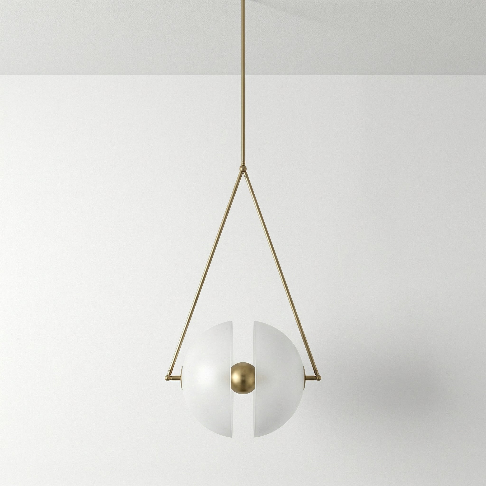 Pendente de vidro opal dividido em dois semicírculos com fenda central — uma peça escultórica que questiona onde termina a luminária e começa a obra de arte. A estrutura triangular em metal que a sustenta é tão marcante quanto o próprio difusor. Explore nossa coleção de luminárias modernas.