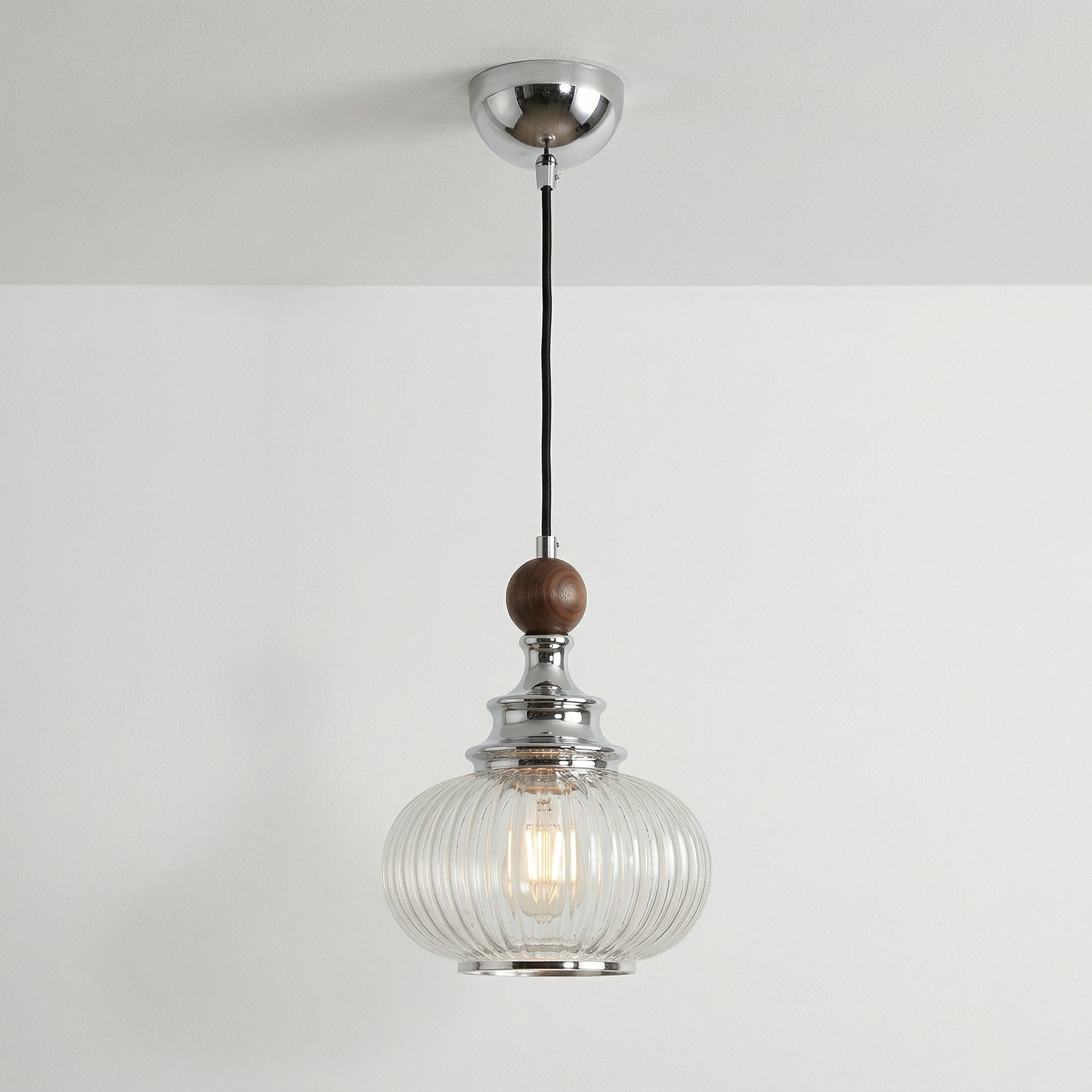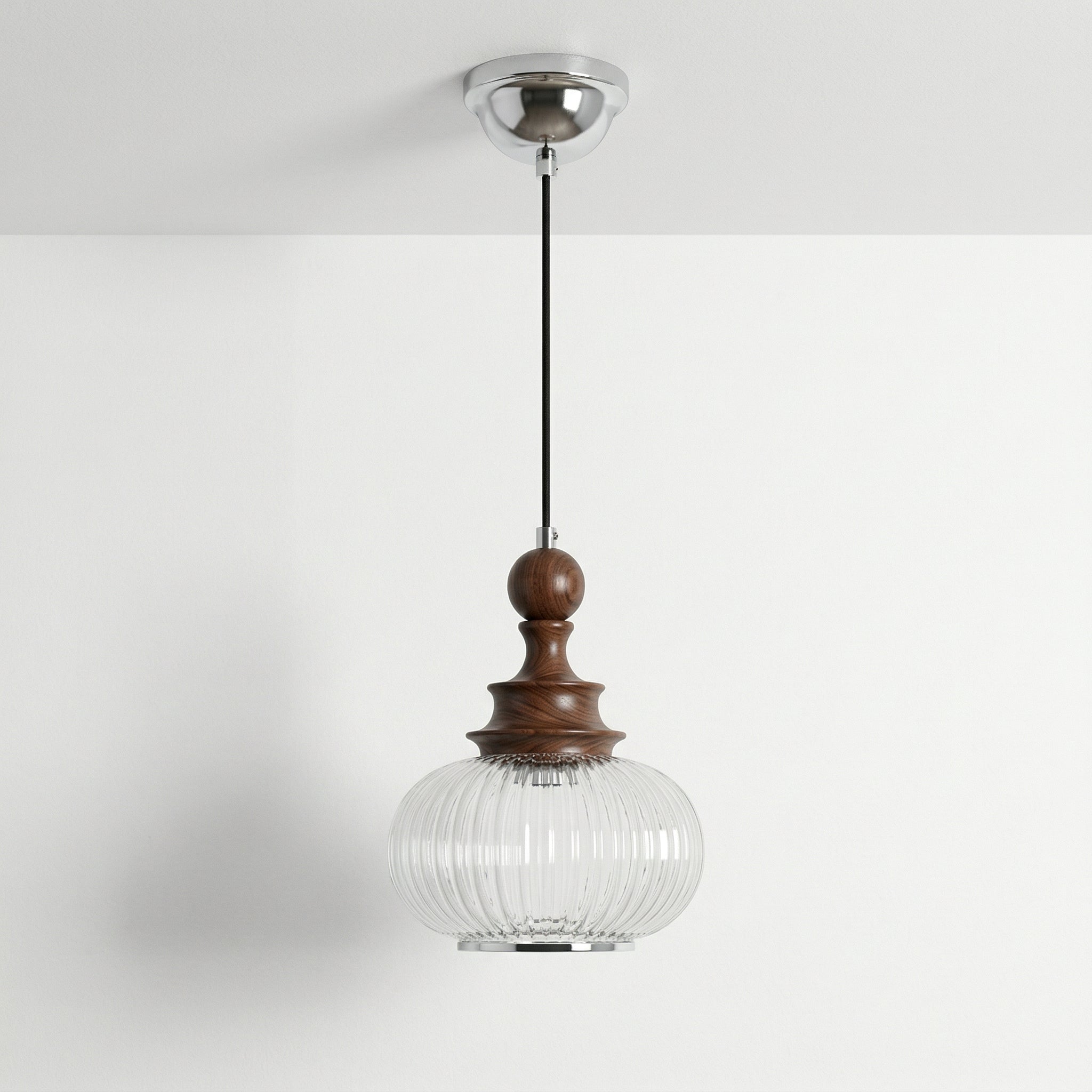 Há algo de irresistível neste pendente de vidro canelado: a cúpula globo transparente abraçada por um detalhe em madeira escura cria aquela atmosfera aconchegante que transforma qualquer ambiente. Um pendente clássico com alma atemporal, perfeito para mesa de jantar ou cabeceira. Conheça nossa linha de luminárias clássicas.