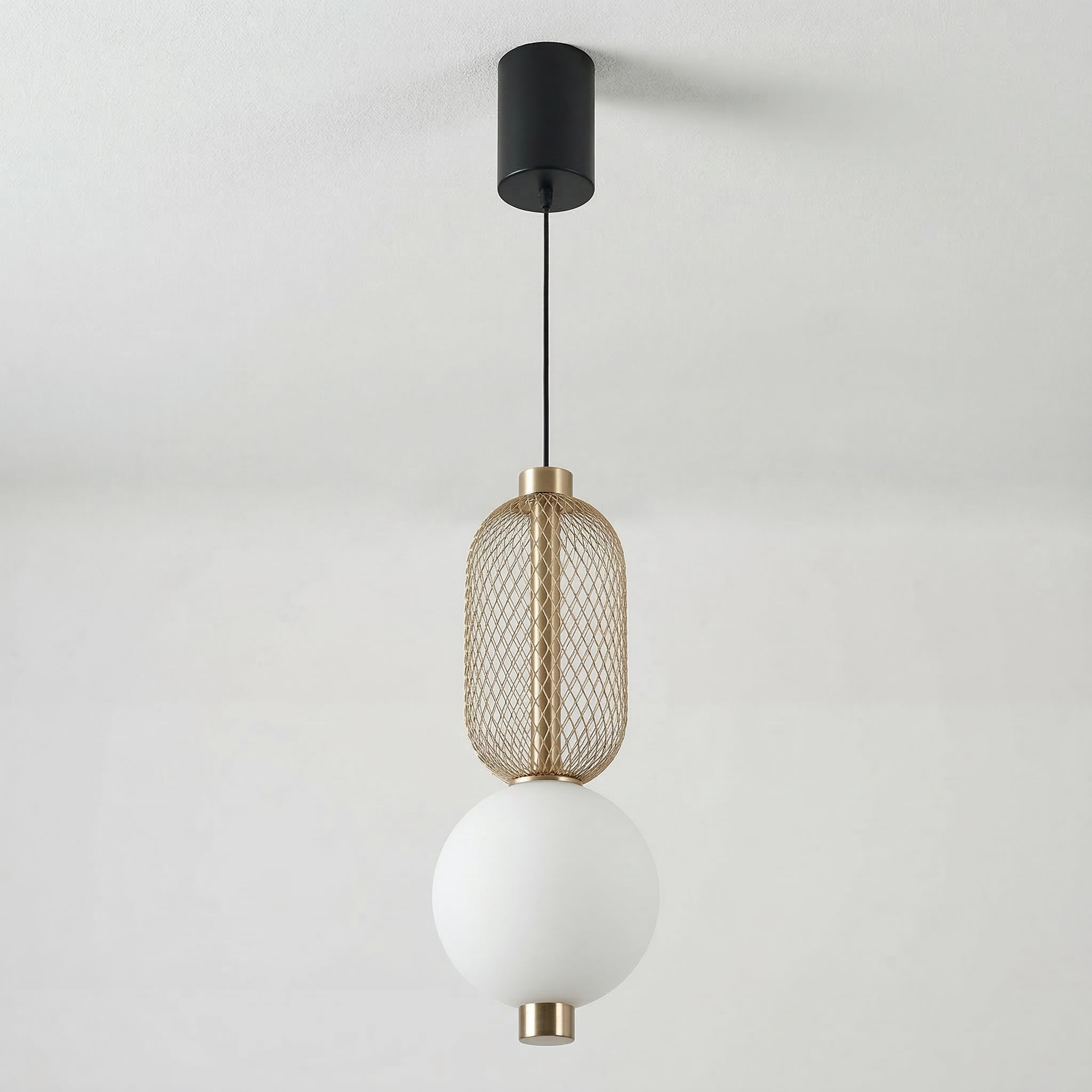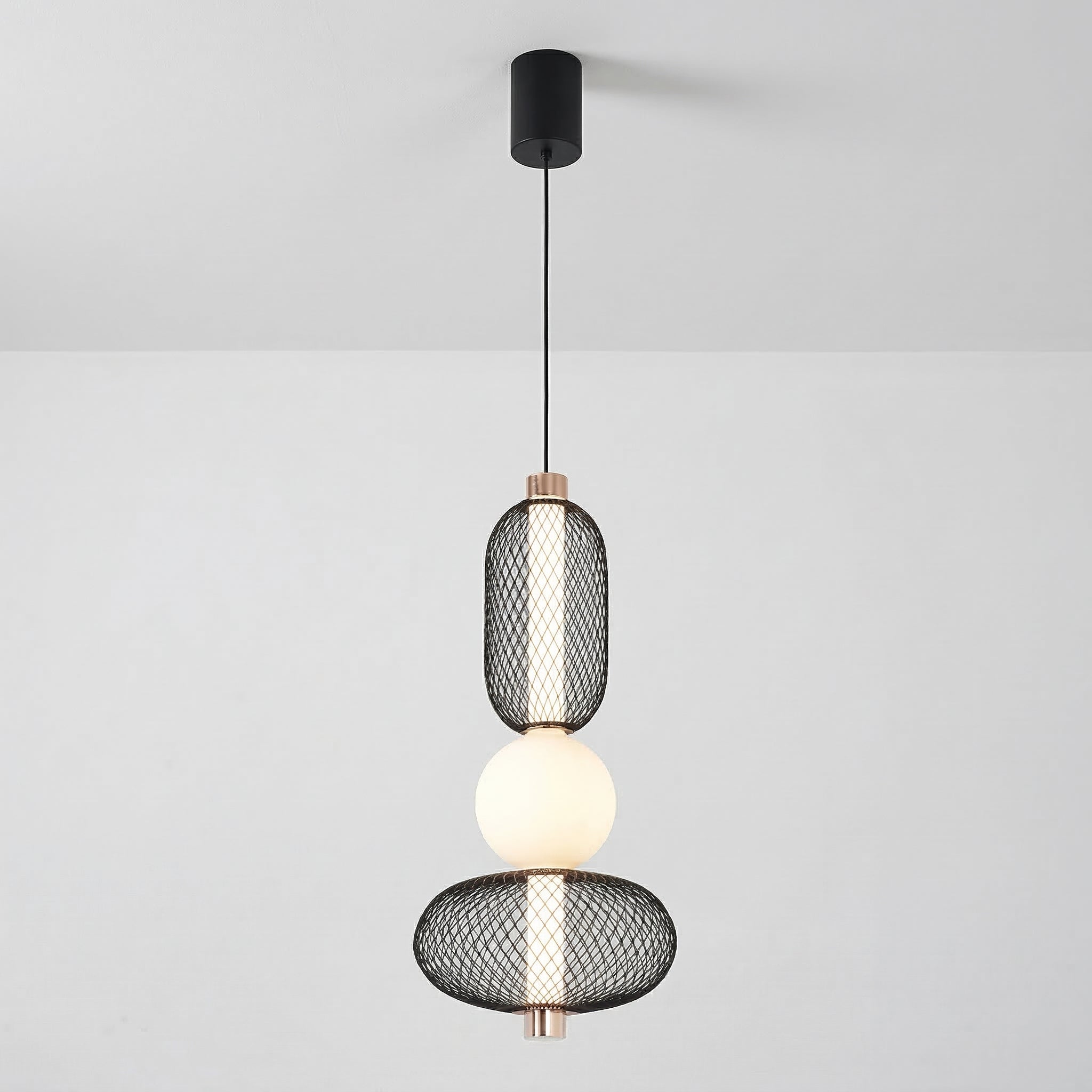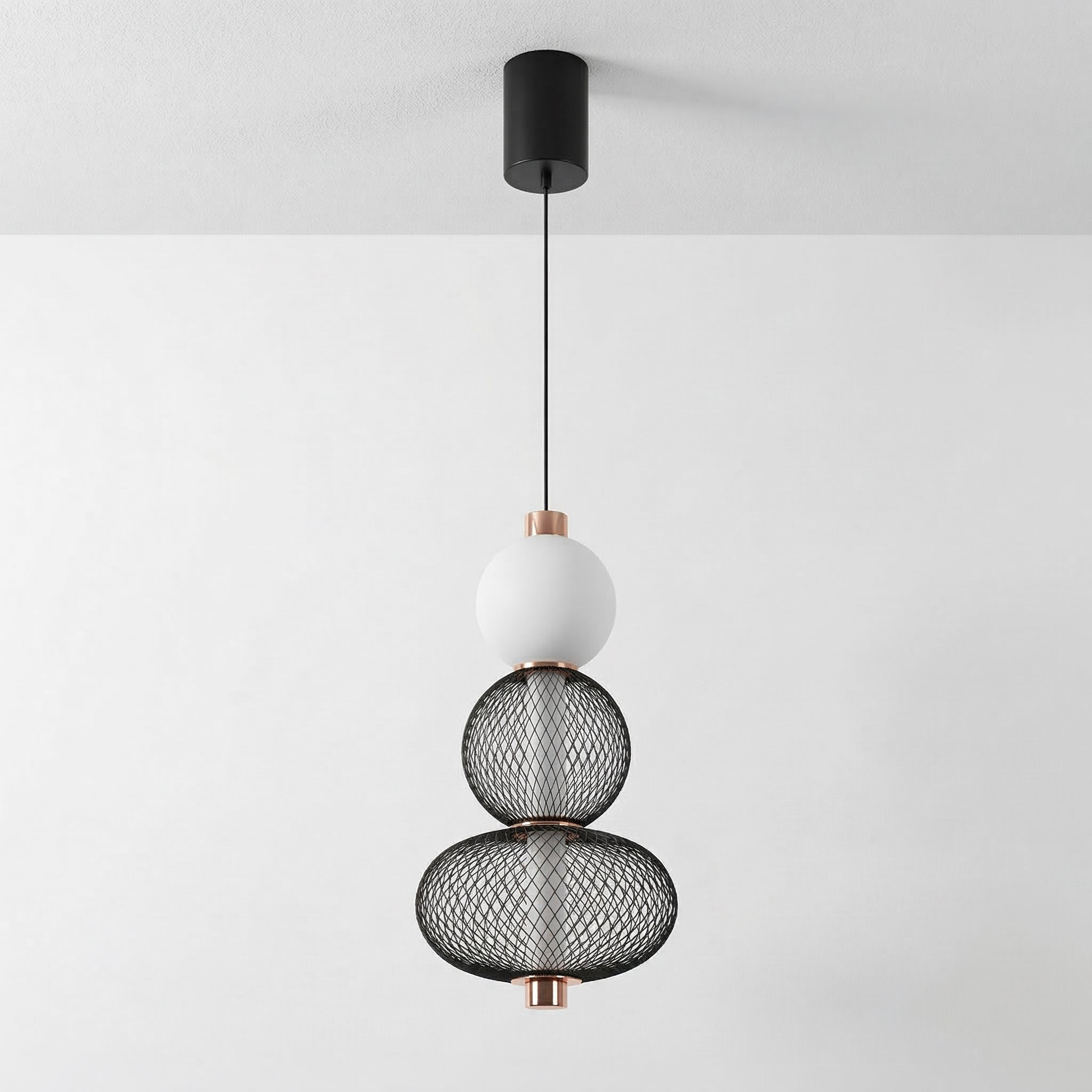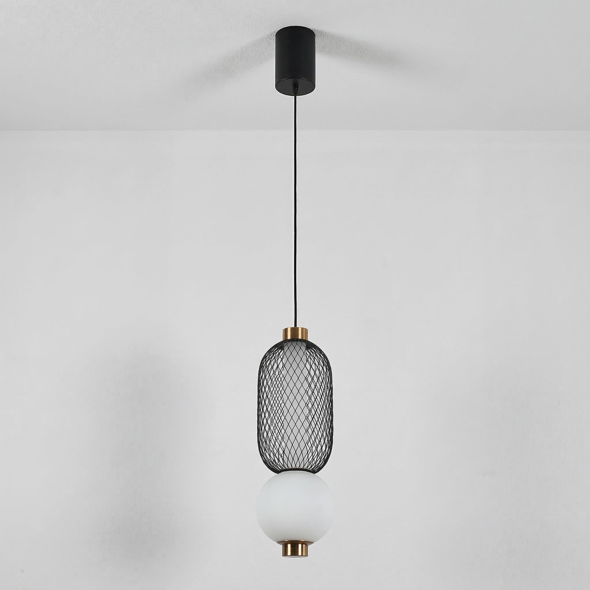 Difícil passar despercebido: este pendente moderno combina uma gaiola aramada preta com uma esfera de vidro opalino, separadas por um delicado anel em cobre. O contraste entre texturas cria um visual contemporâneo e sofisticado, perfeito para quem quer iluminação como ponto focal. Explore nossa coleção de luminárias modernas.