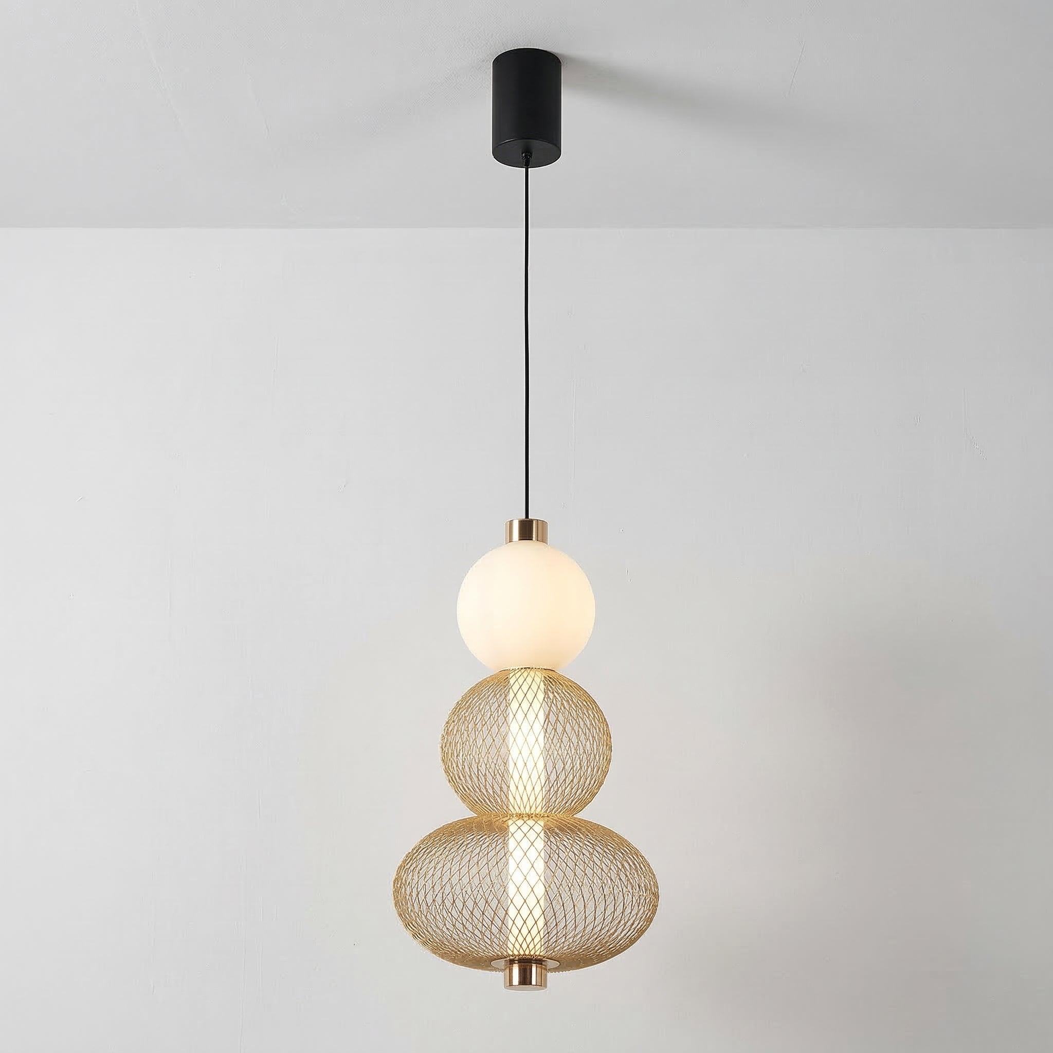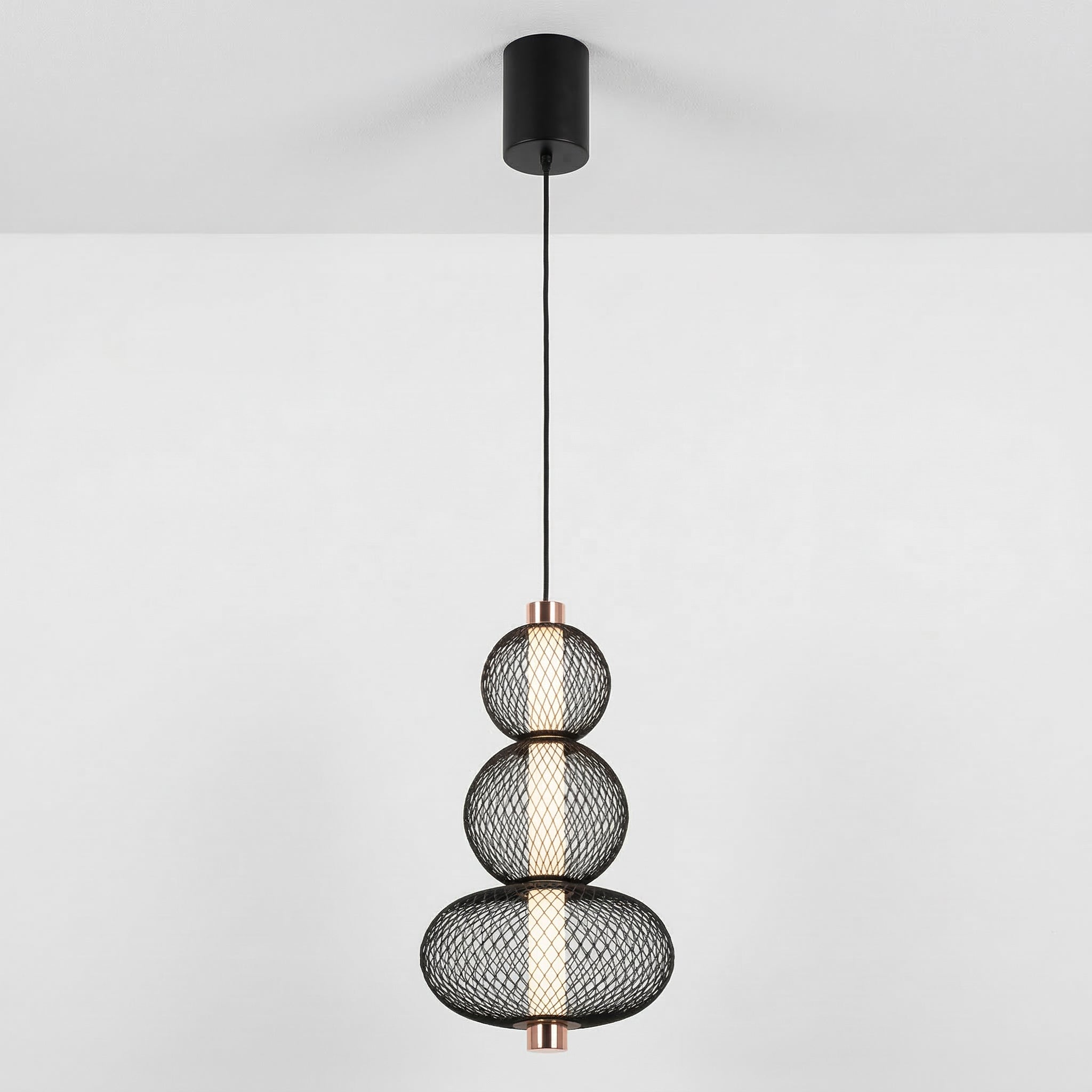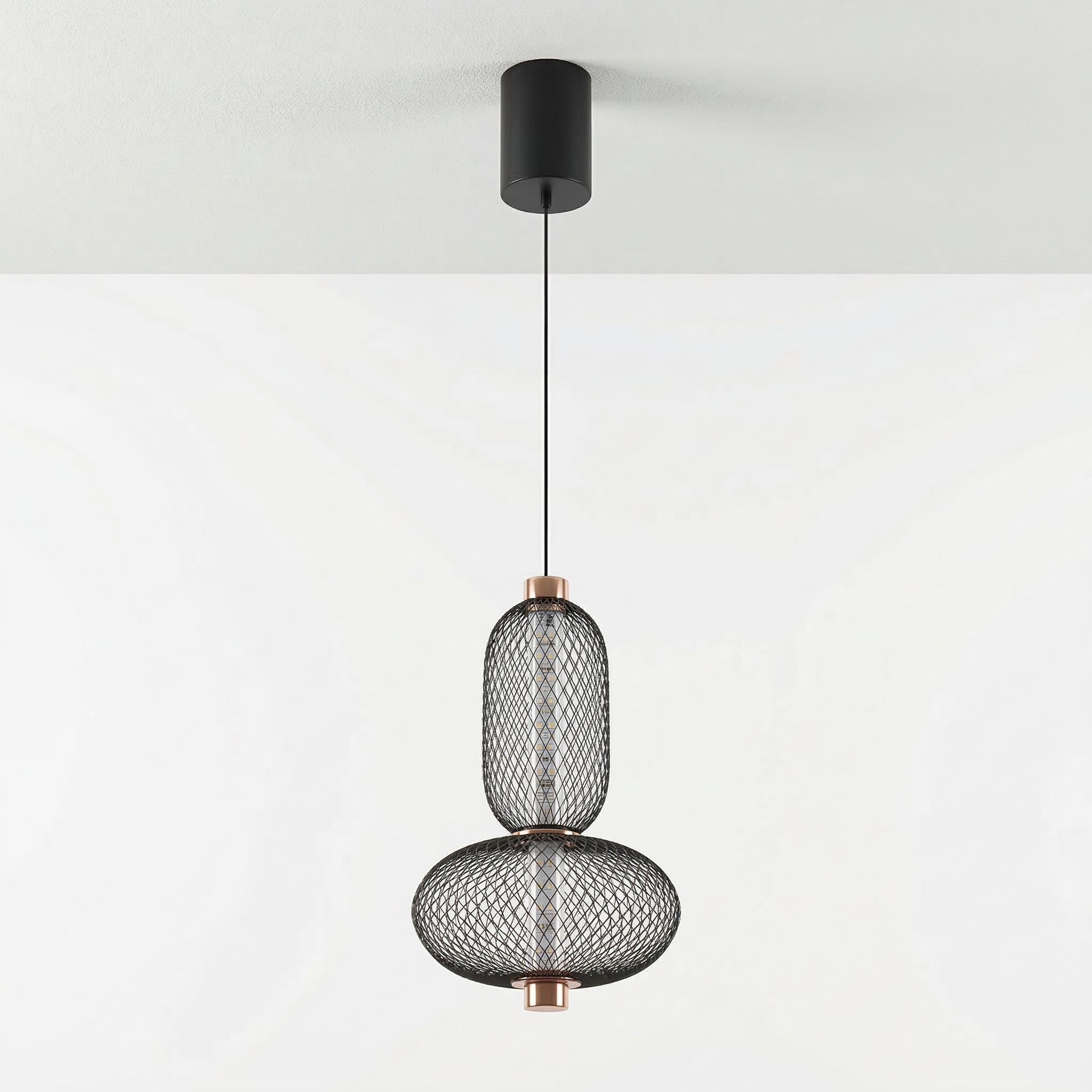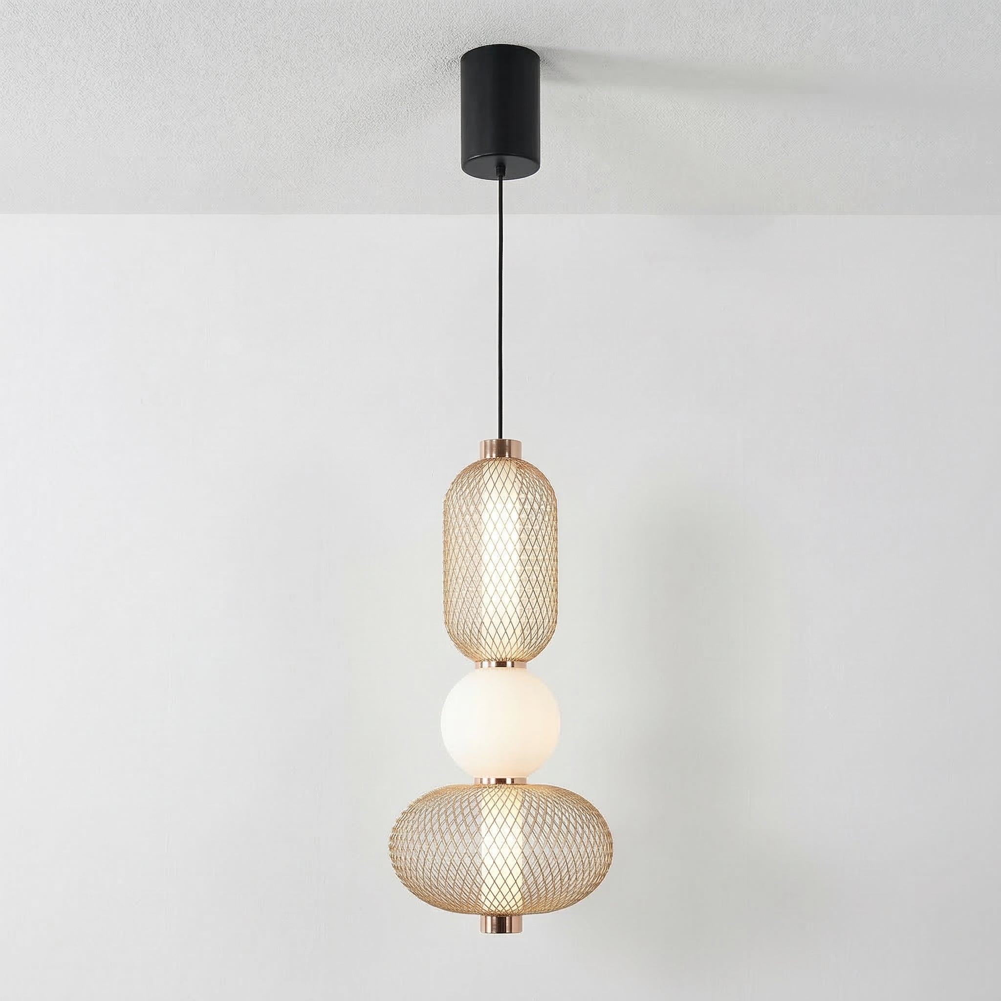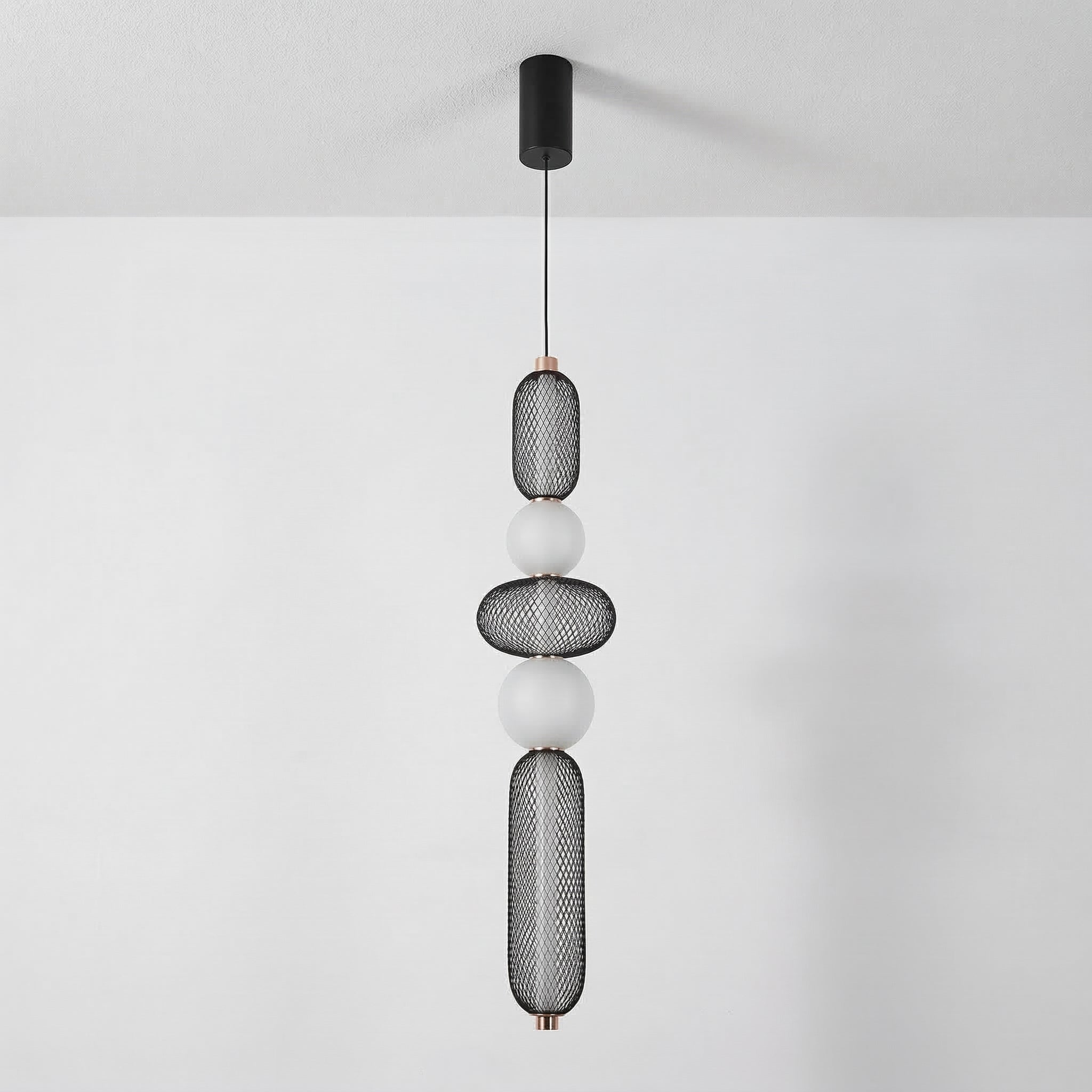 Difícil passar despercebido: este pendente moderno combina uma gaiola aramada preta com uma esfera de vidro opalino, separadas por um delicado anel em cobre. O contraste entre texturas cria um visual contemporâneo e sofisticado, perfeito para quem quer iluminação como ponto focal. Explore nossa coleção de luminárias modernas.
