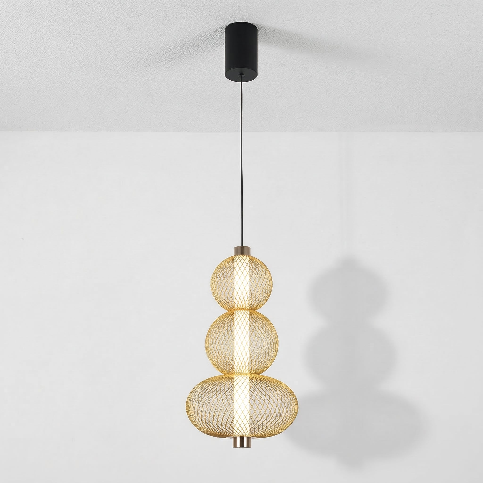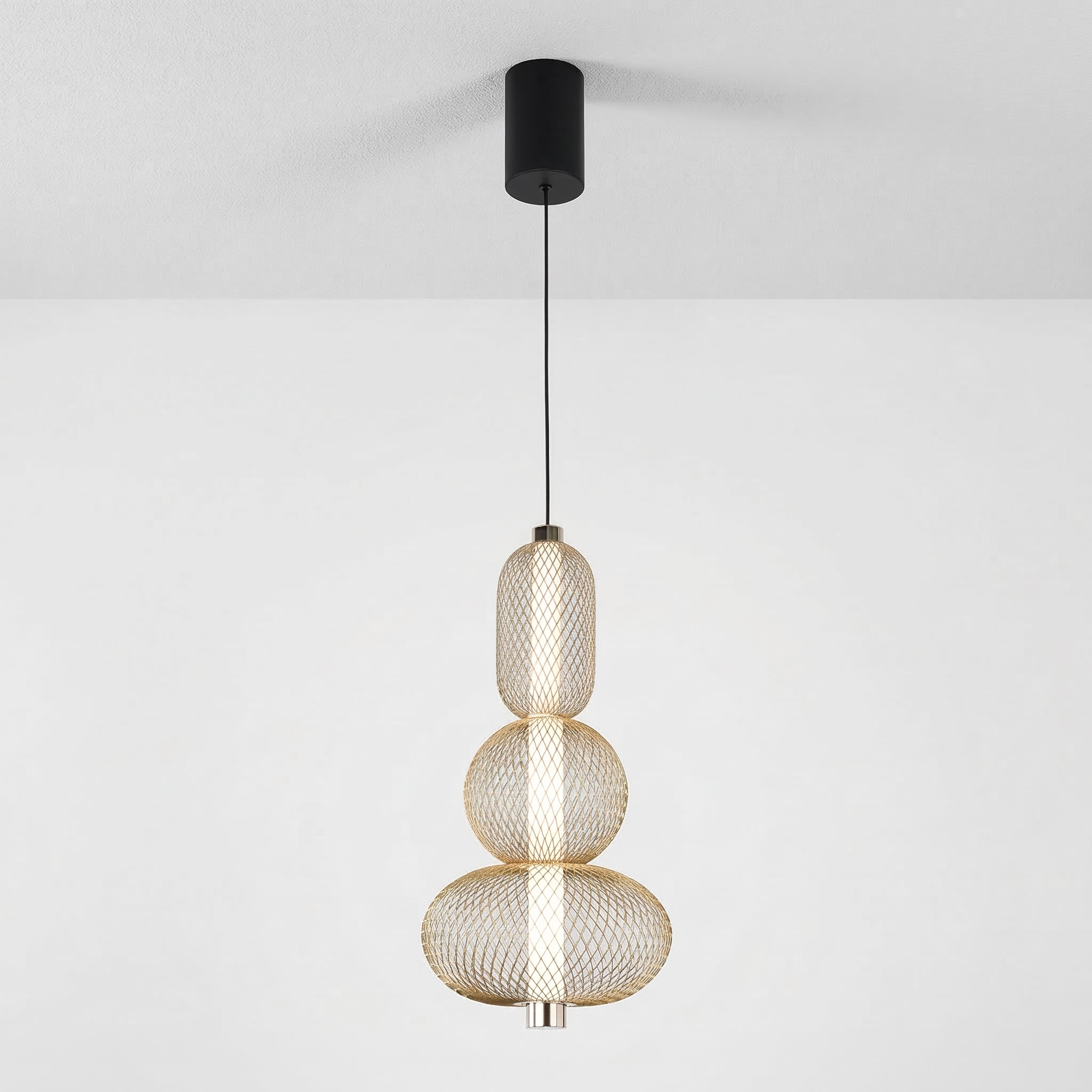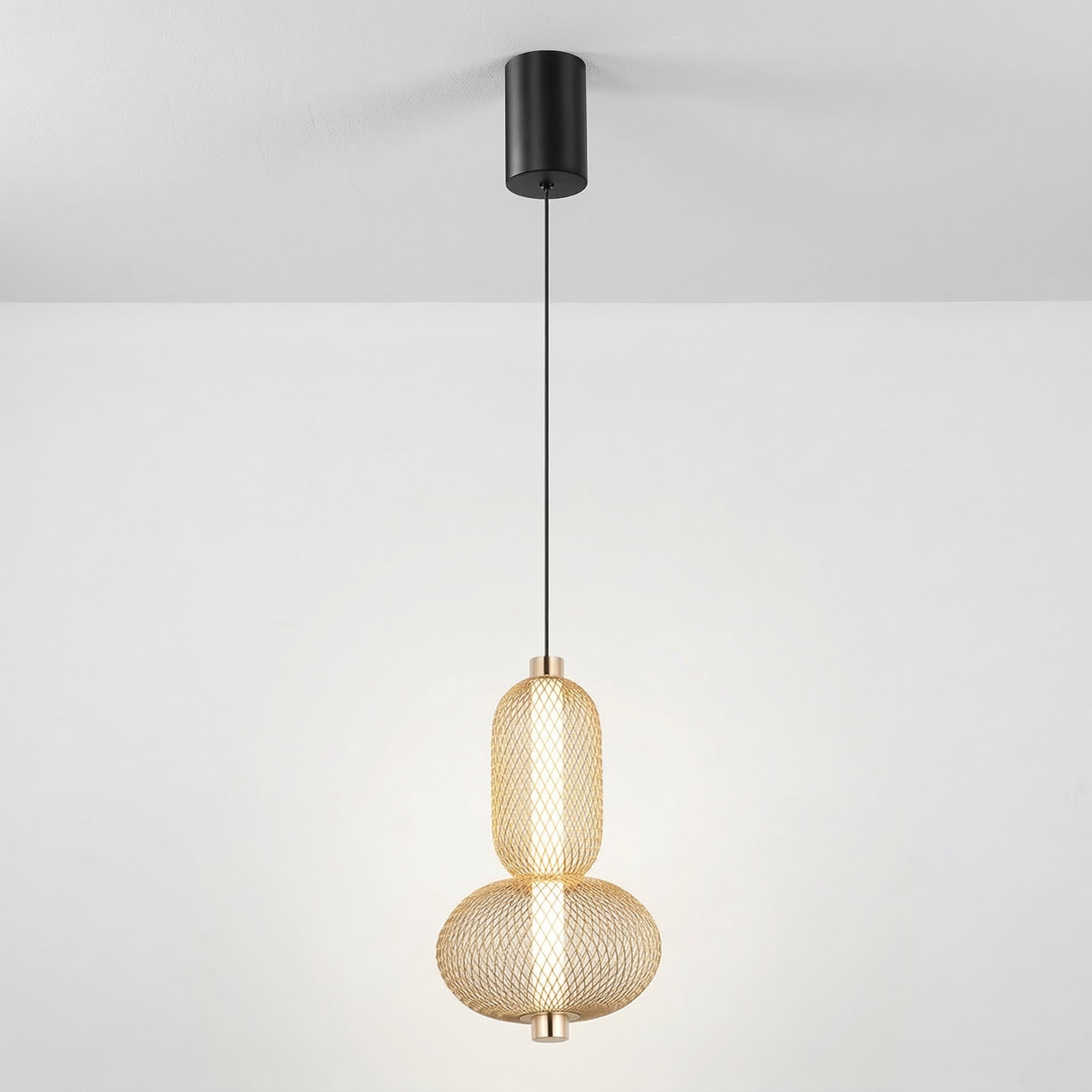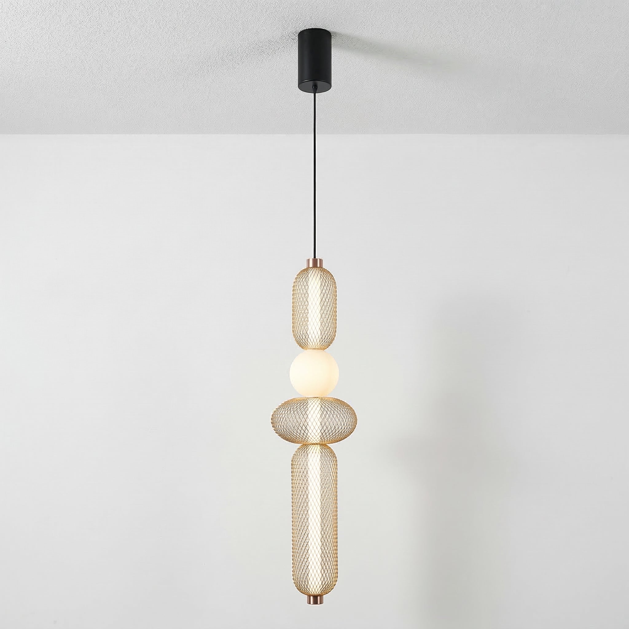 Difícil passar despercebido: este pendente moderno combina uma gaiola aramada preta com uma esfera de vidro opalino, separadas por um delicado anel em cobre. O contraste entre texturas cria um visual contemporâneo e sofisticado, perfeito para quem quer iluminação como ponto focal. Explore nossa coleção de luminárias modernas.