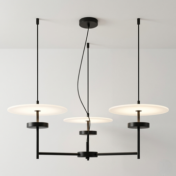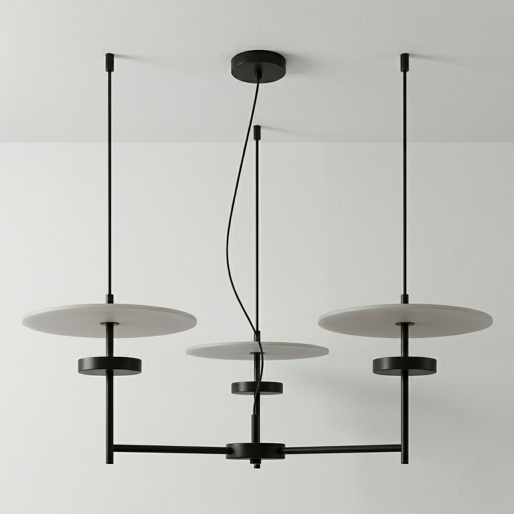 Três discos flutuantes em metal preto fosco com difusores opalinos — o pendente triplo moderno que transforma mesas de jantar em cenários de design. Alturas reguláveis individualmente criam composições únicas e sofisticadas. Explore nossa coleção de luminárias modernas.