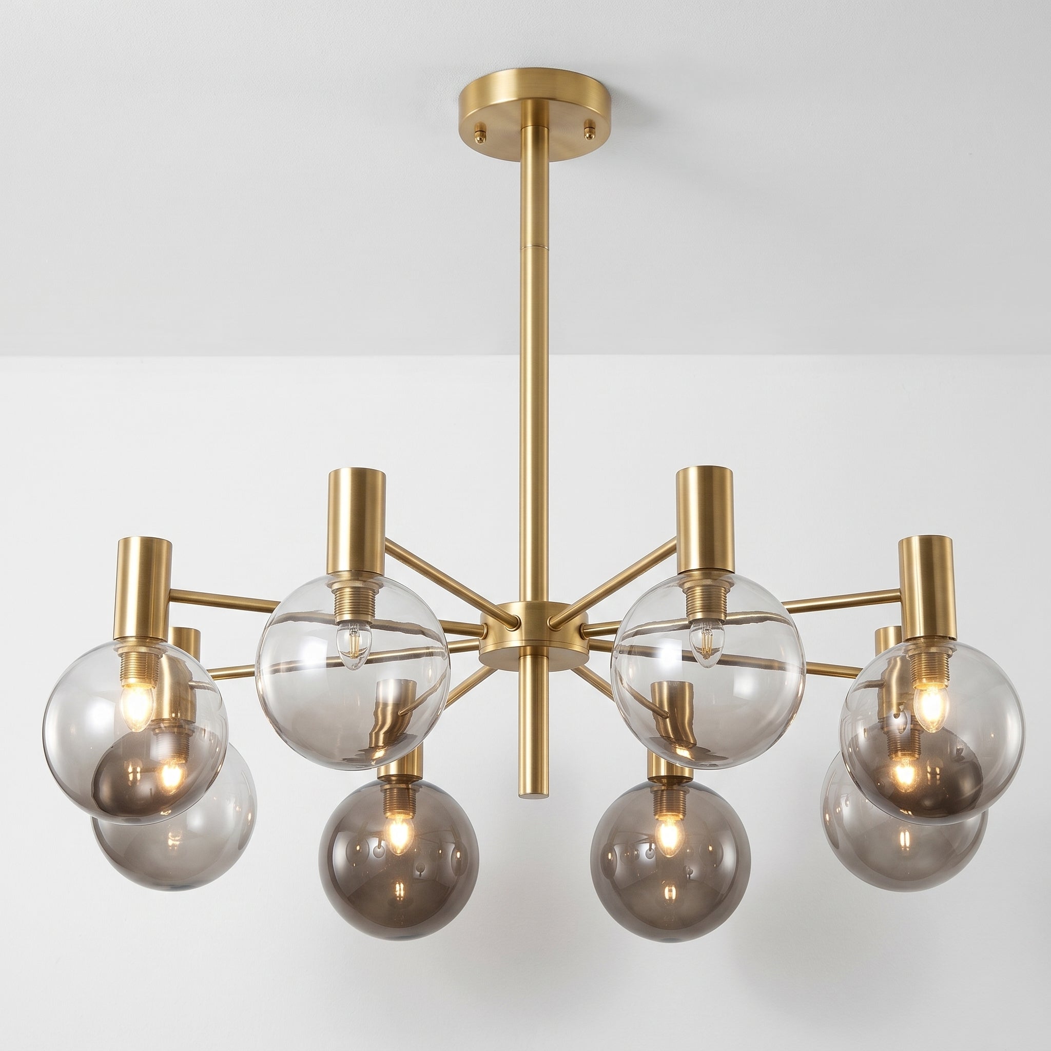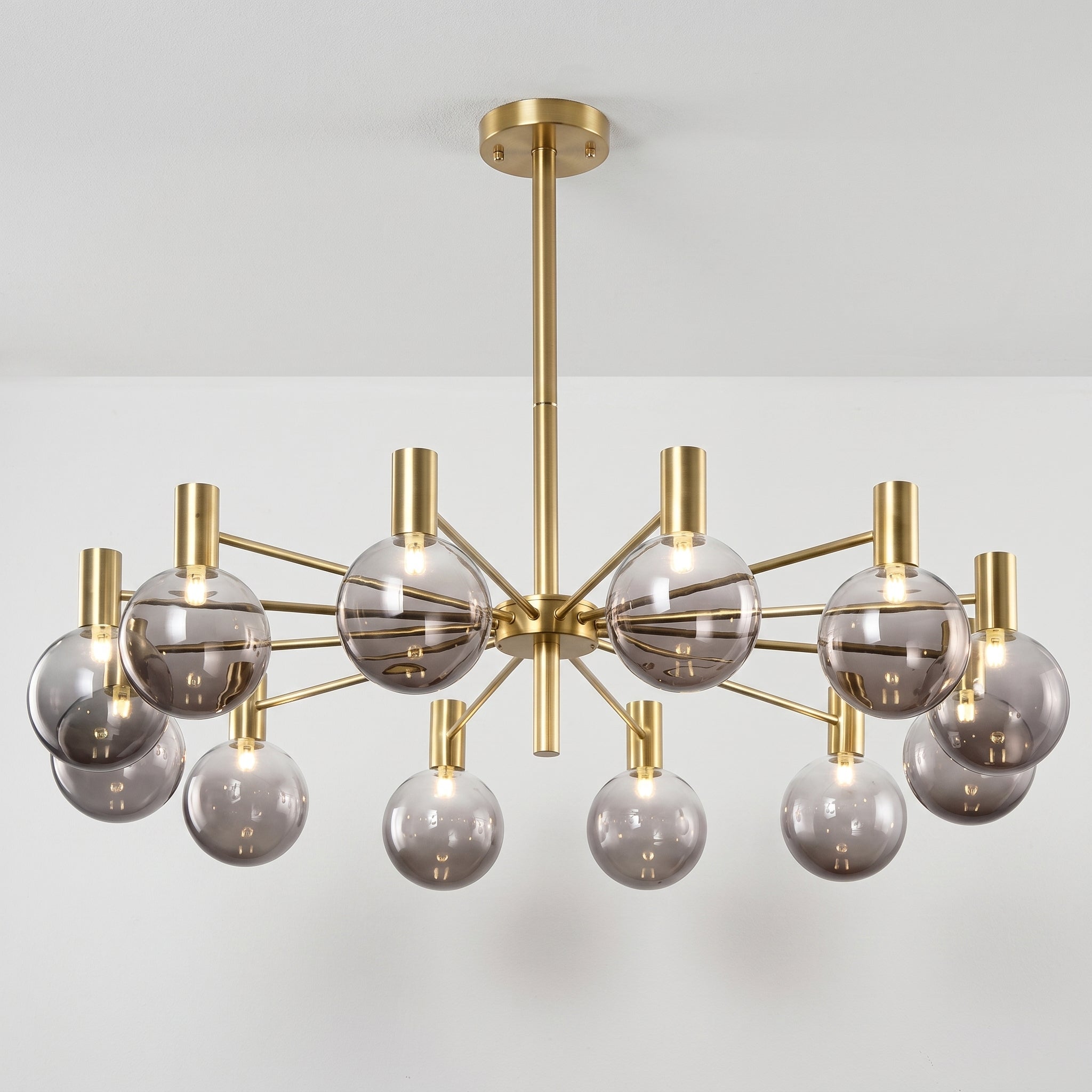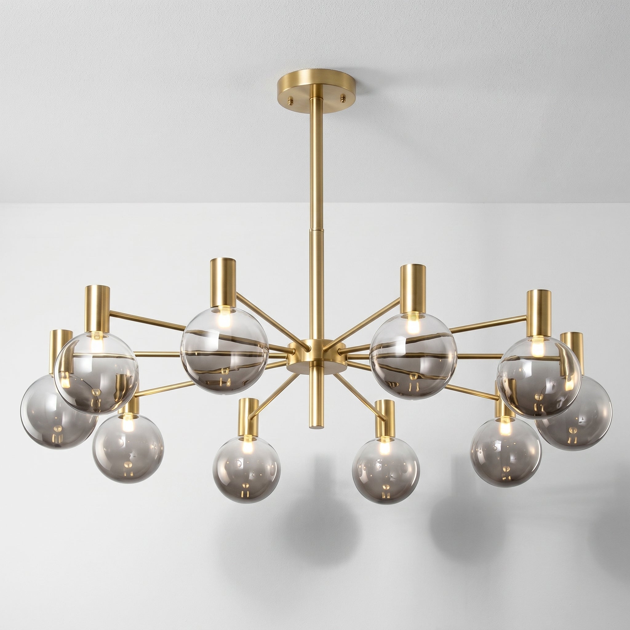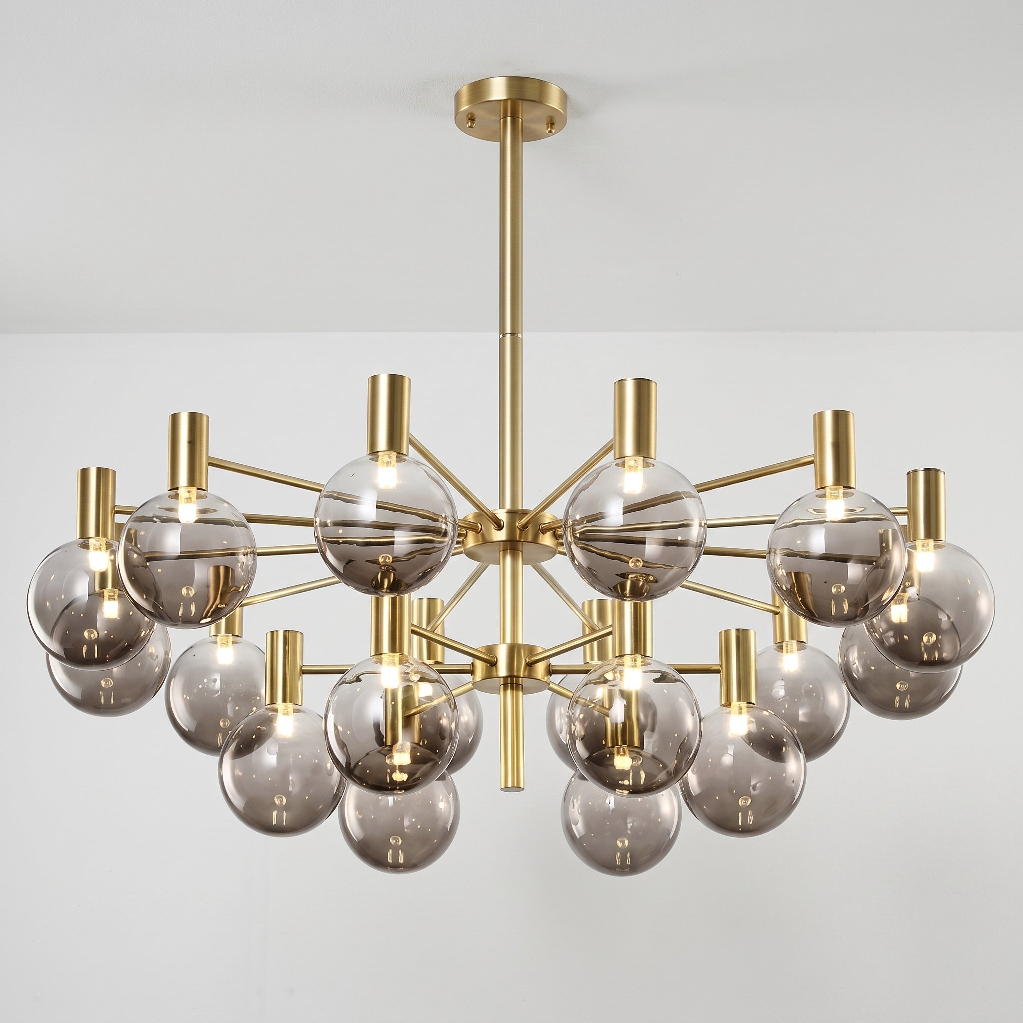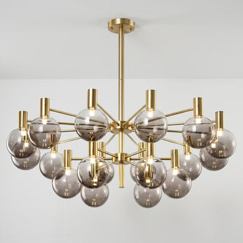Lustre com braços radiais em metal dourado champagne ou preto fosco e pares de globos em vidro fumê — grande e pequeno em cada haste, criando profundidade visual incomparável para sala de jantar ou sala de estar de alto padrão. Explore nossa coleção de luminárias modernas.