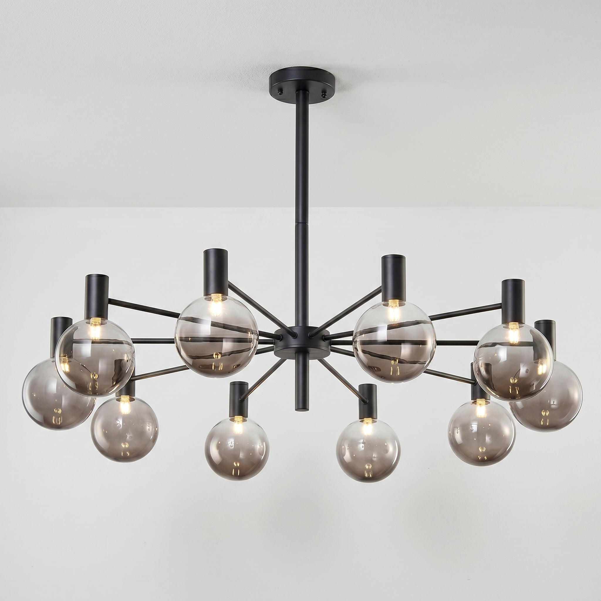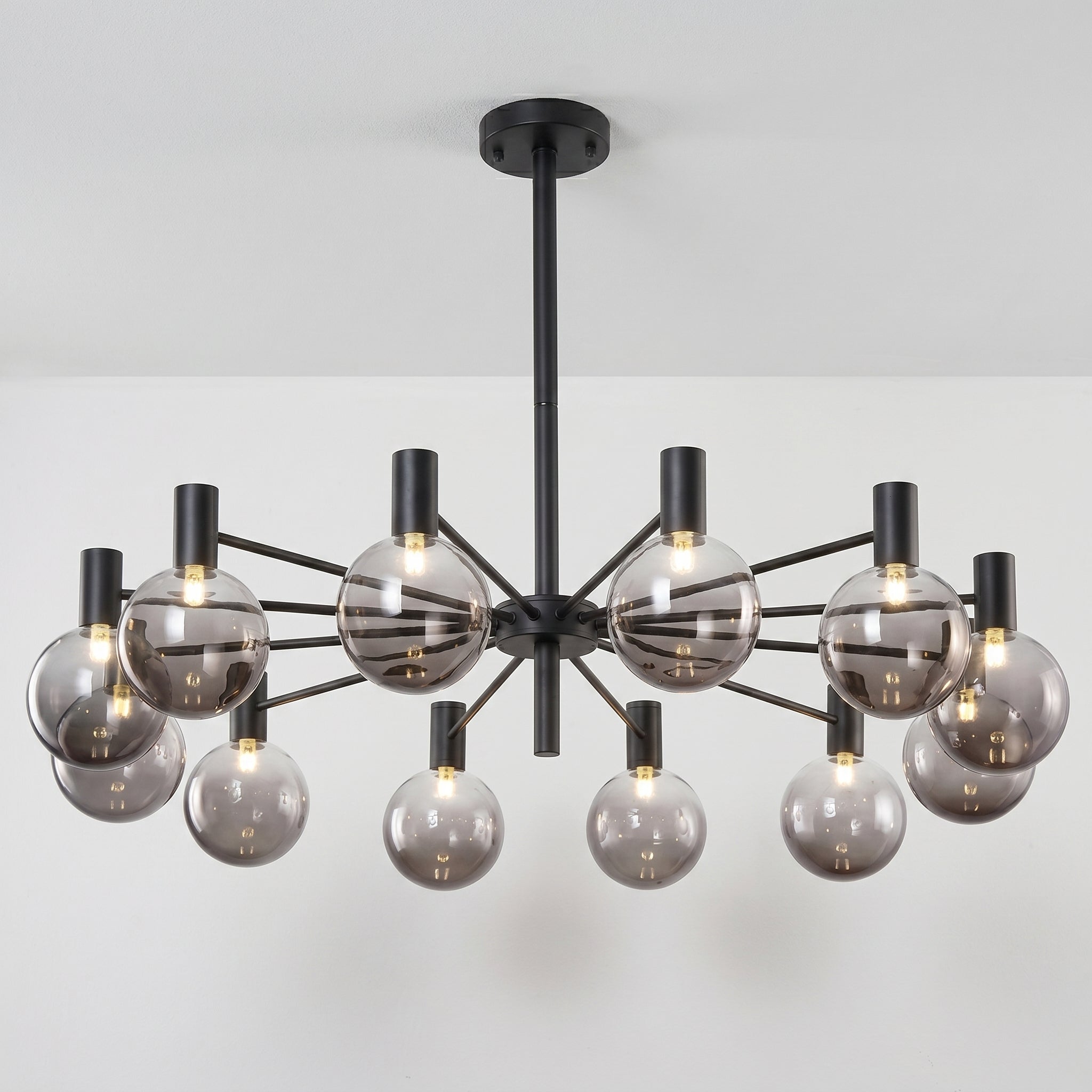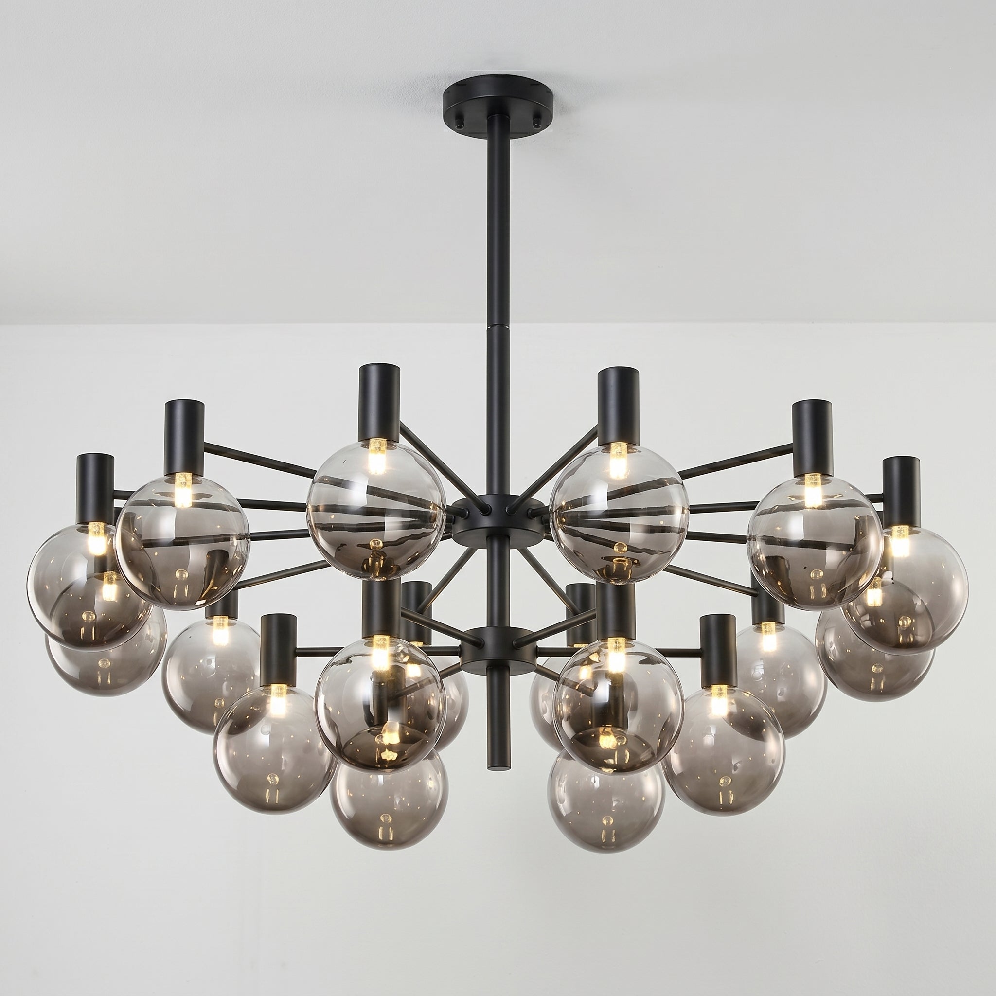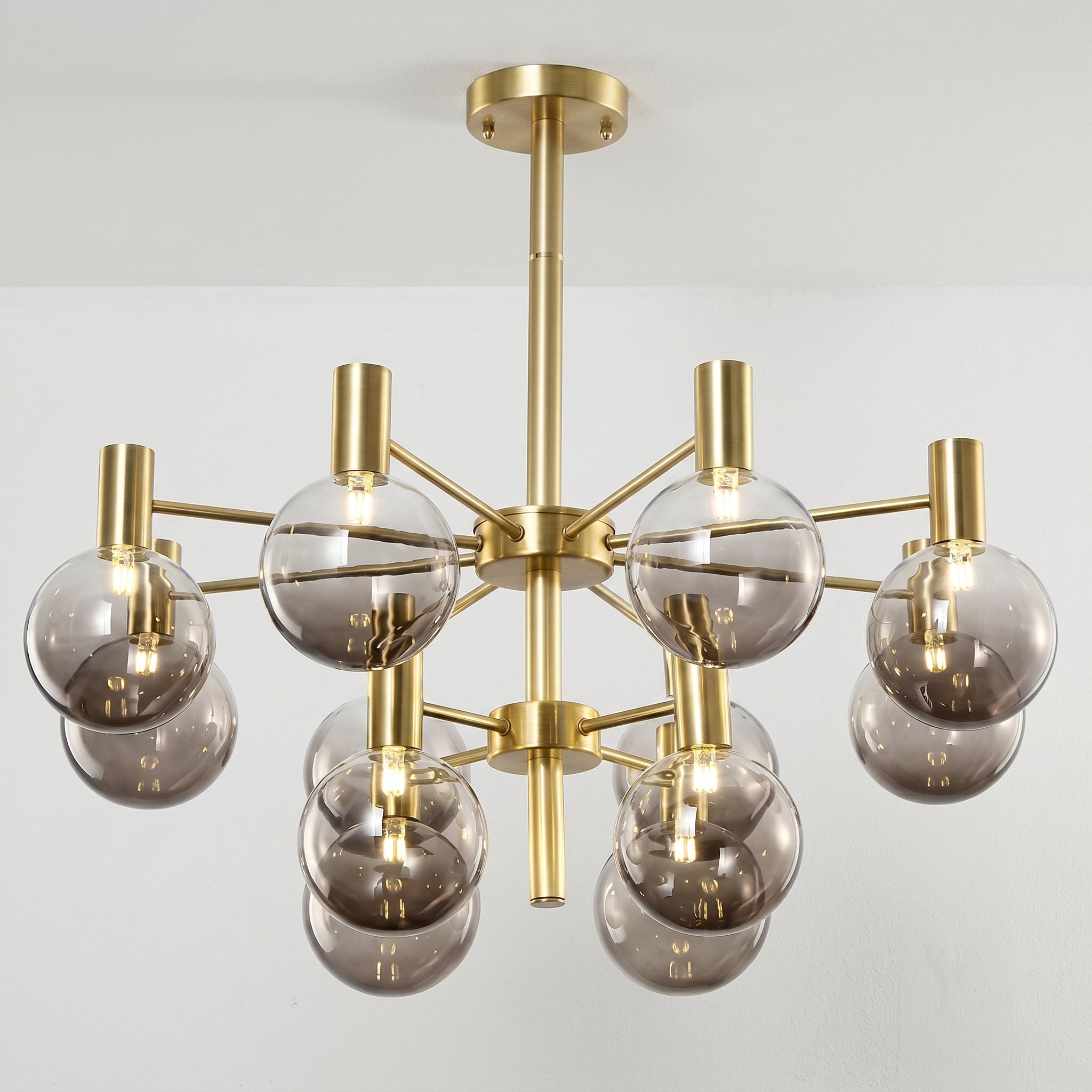Lustre com braços radiais em metal dourado champagne ou preto fosco e pares de globos em vidro fumê — grande e pequeno em cada haste, criando profundidade visual incomparável para sala de jantar ou sala de estar de alto padrão. Explore nossa coleção de luminárias modernas.