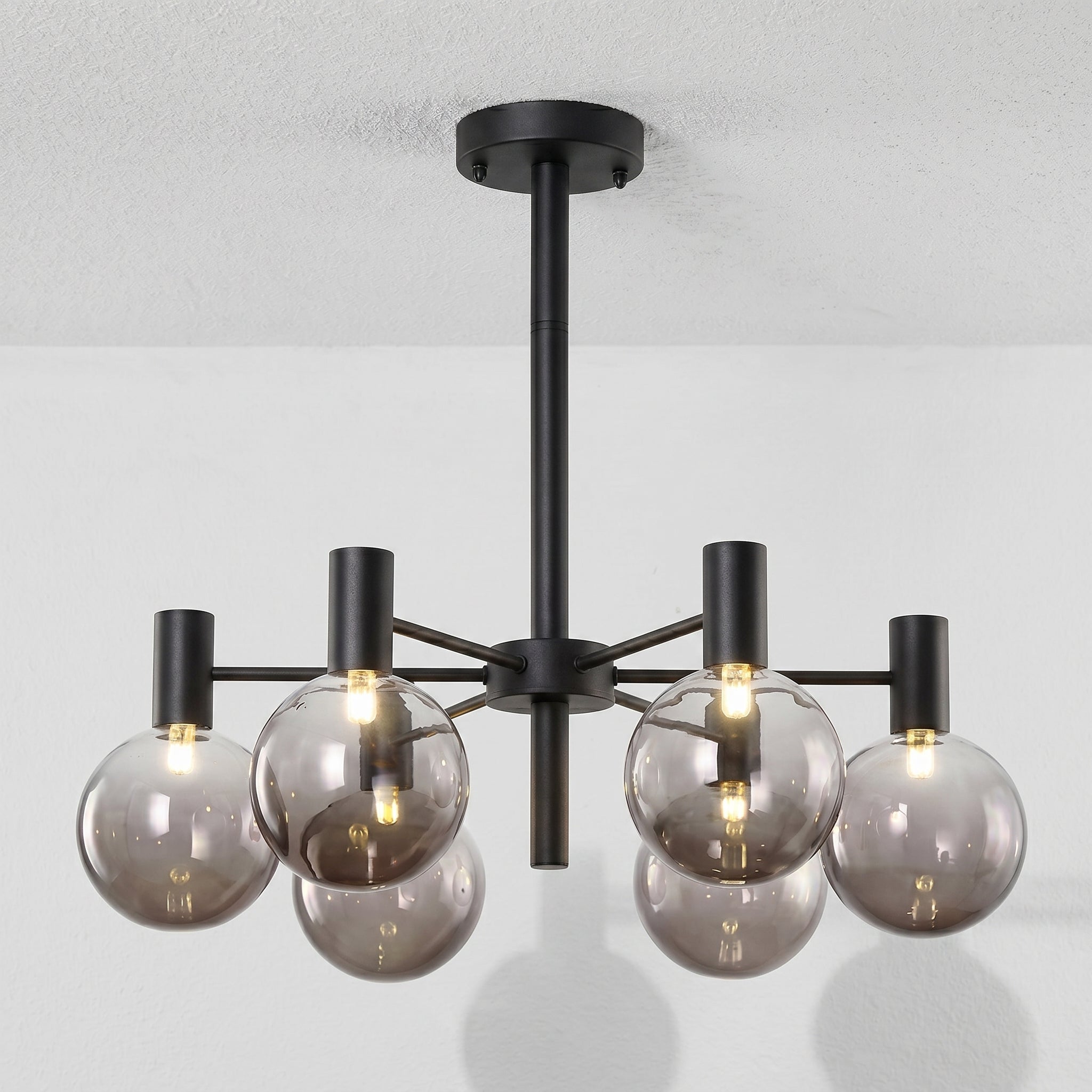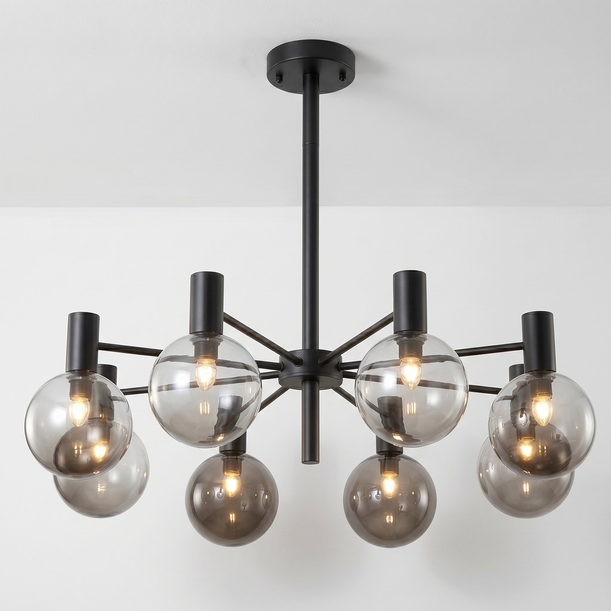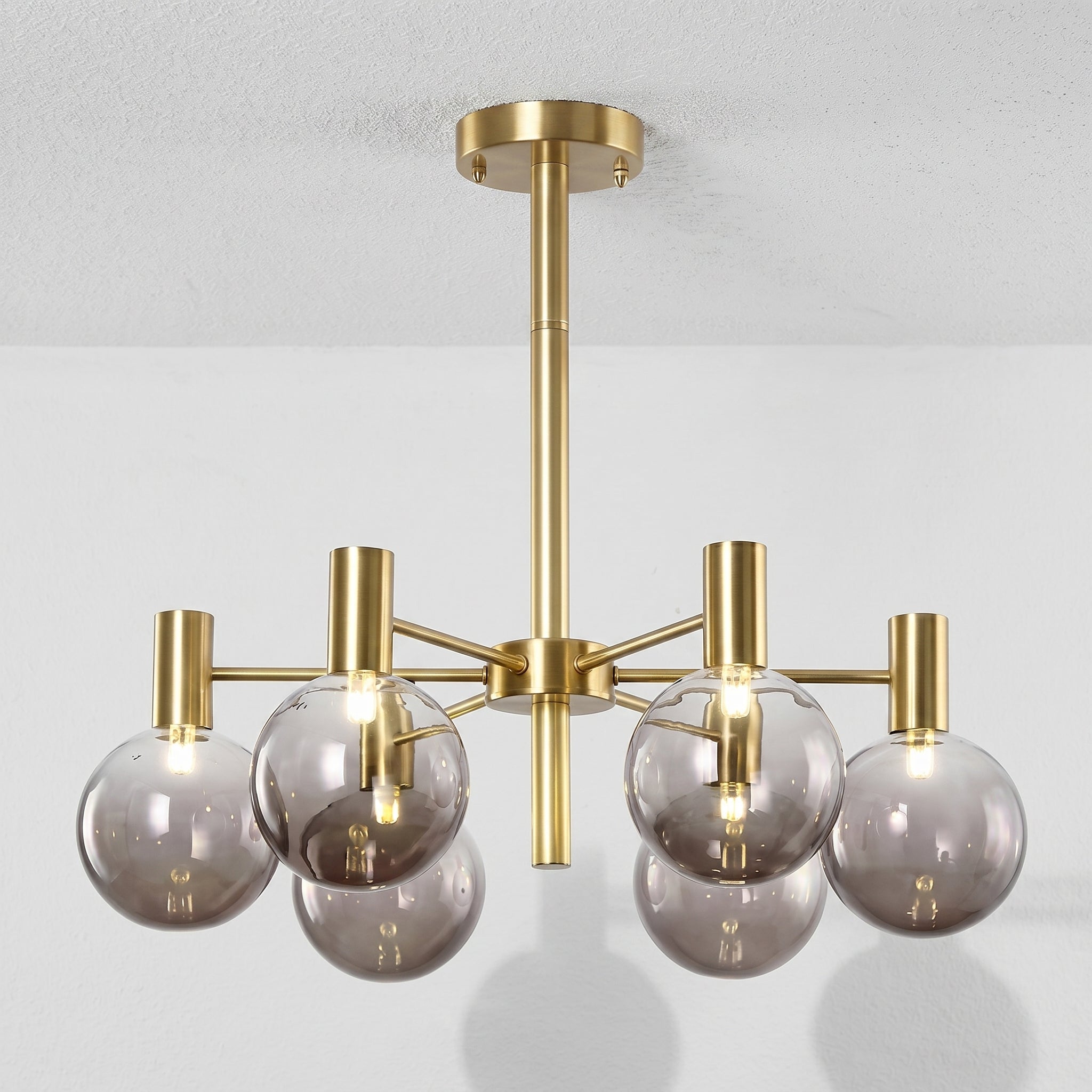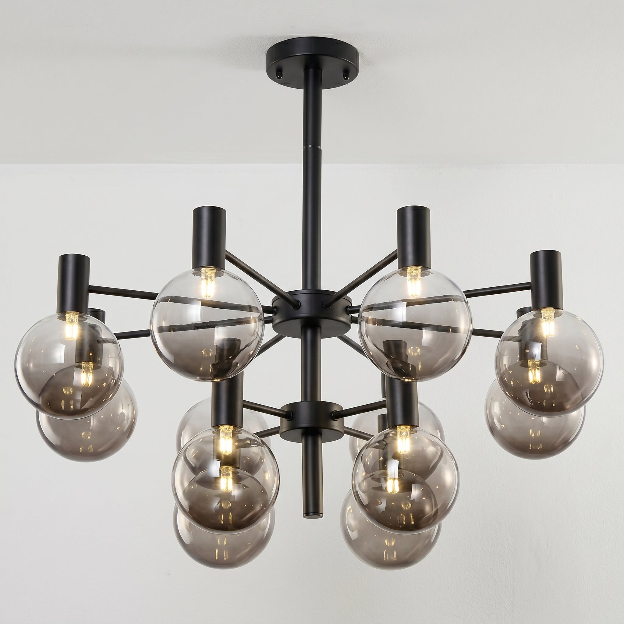 Lustre com braços radiais em metal dourado champagne ou preto fosco e pares de globos em vidro fumê — grande e pequeno em cada haste, criando profundidade visual incomparável para sala de jantar ou sala de estar de alto padrão. Explore nossa coleção de luminárias modernas.