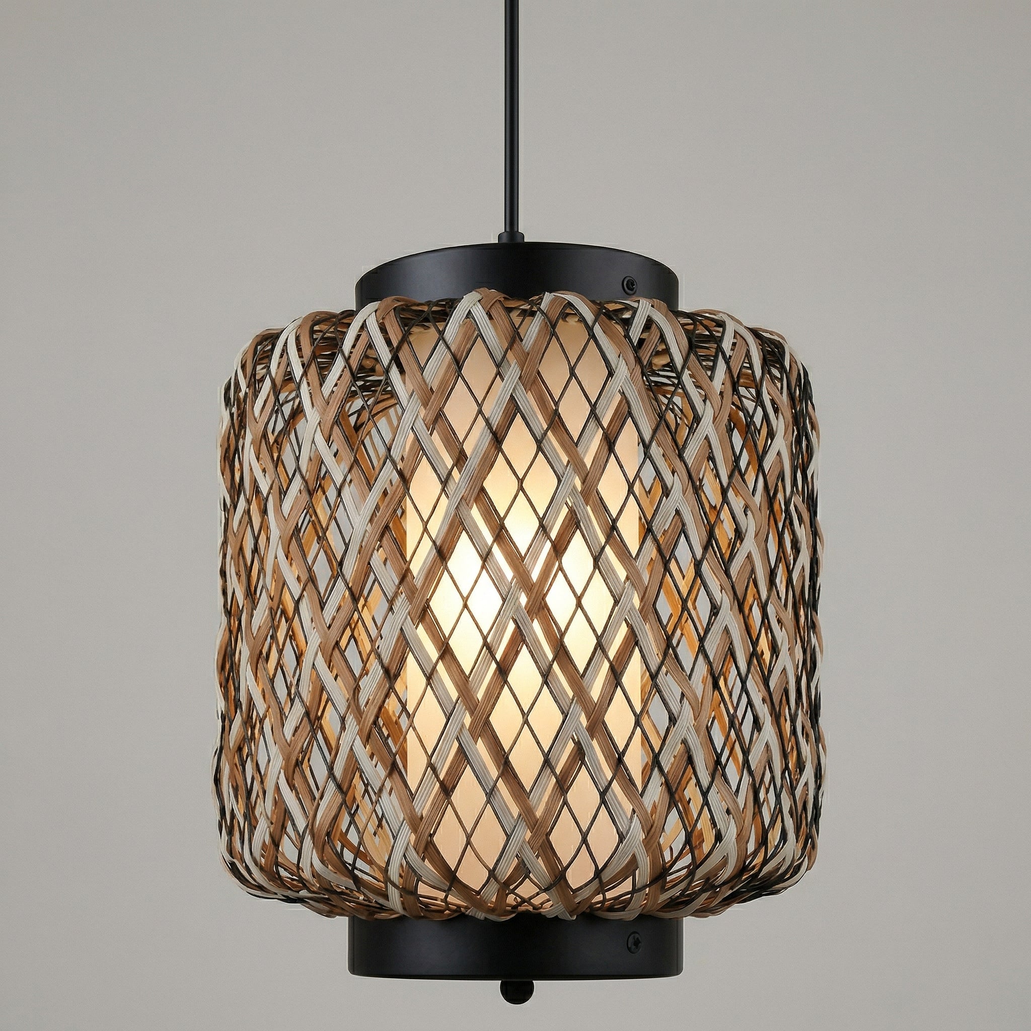 Pendente rústico em vime trançado à mão com padrão xadrez diagonal e estrutura cilíndrica em metal preto fosco — a combinação entre o natural e o contemporâneo que designers de interiores adoram. O cabo regulável de 1,5m adapta-se a qualquer pé-direito. Explore nossa coleção de luminárias rústicas.