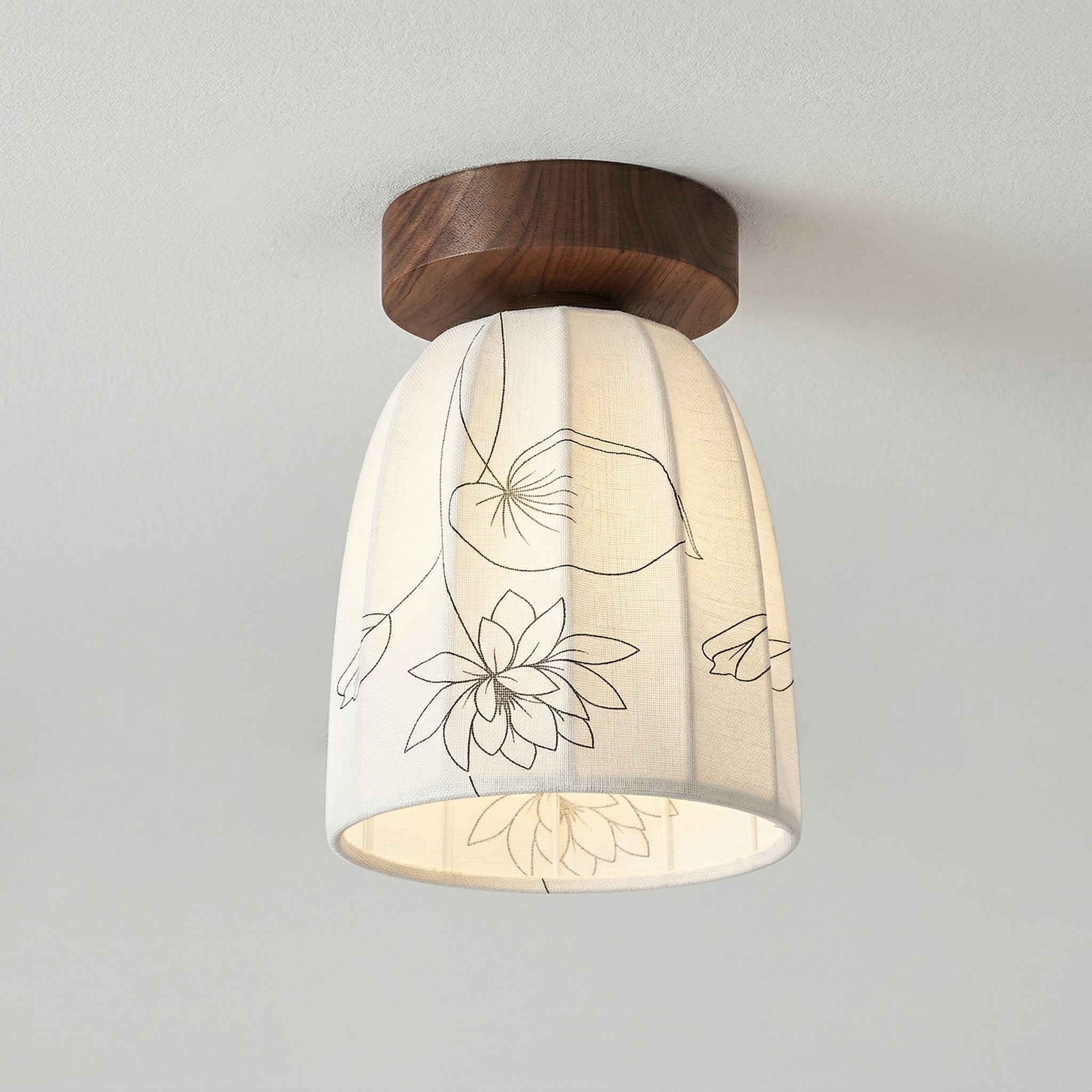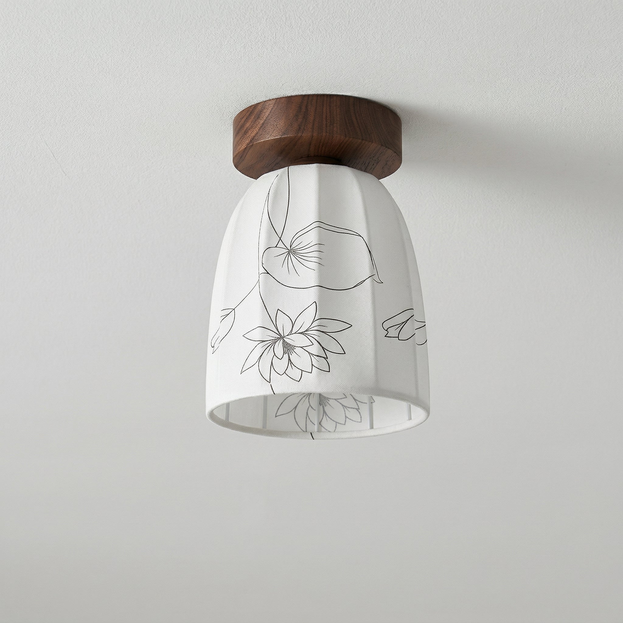 Uma peça que leva poesia ao teto: o plafon de sobrepor Bell Lotus Wood une cúpula de tecido branco com delicada estampa de lótus e base em madeira escura. Design oriental que transforma corredores e entradas em espaços contemplativos. 15,5 × 21,5cm. Explore as luminárias decorativas da ORNE.
