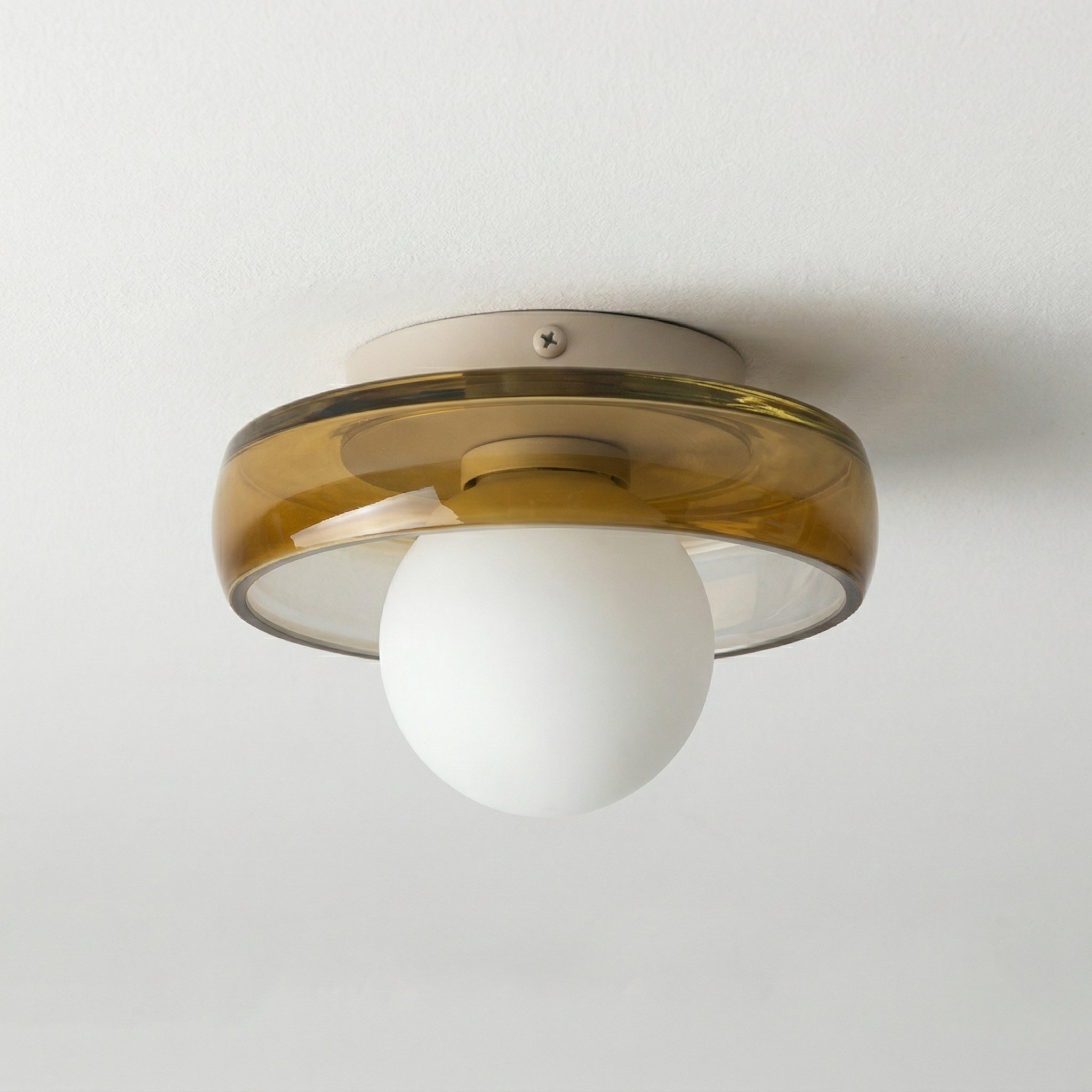 Plafon de sobrepor Springs com formato redondo de 20cm e base disco em metal dourado champagne. A esfera de vidro branco leitoso cria um contraste sofisticado que decora tanto quanto ilumina. Compacto e charmoso, perfeito para corredores e closets. Explore nossa coleção de luminárias modernas.